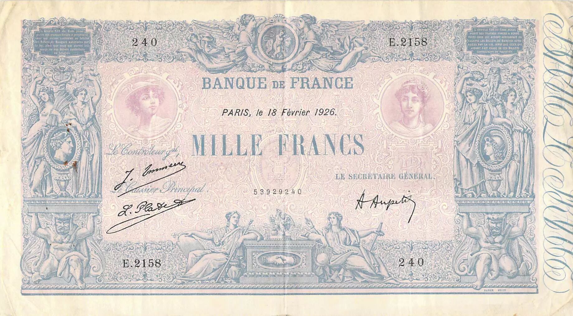 Banknote France 1000 Francs Blue on lilac - 18-02-1926 - Serial E.2158 - VF