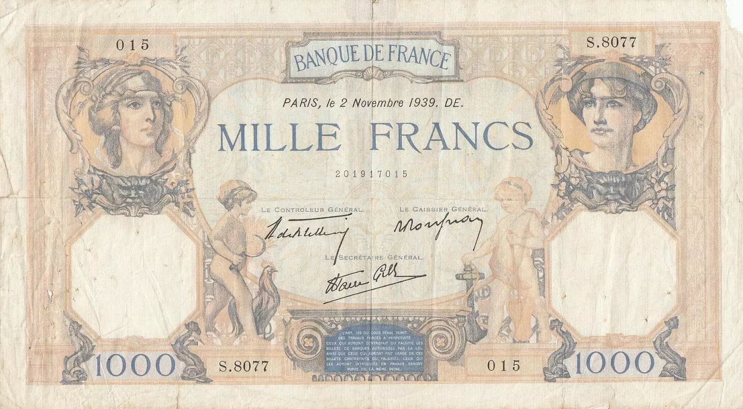 Banknote France 1000 Francs Ceres and Mercury - 02-11-1939 - Serial S.8077