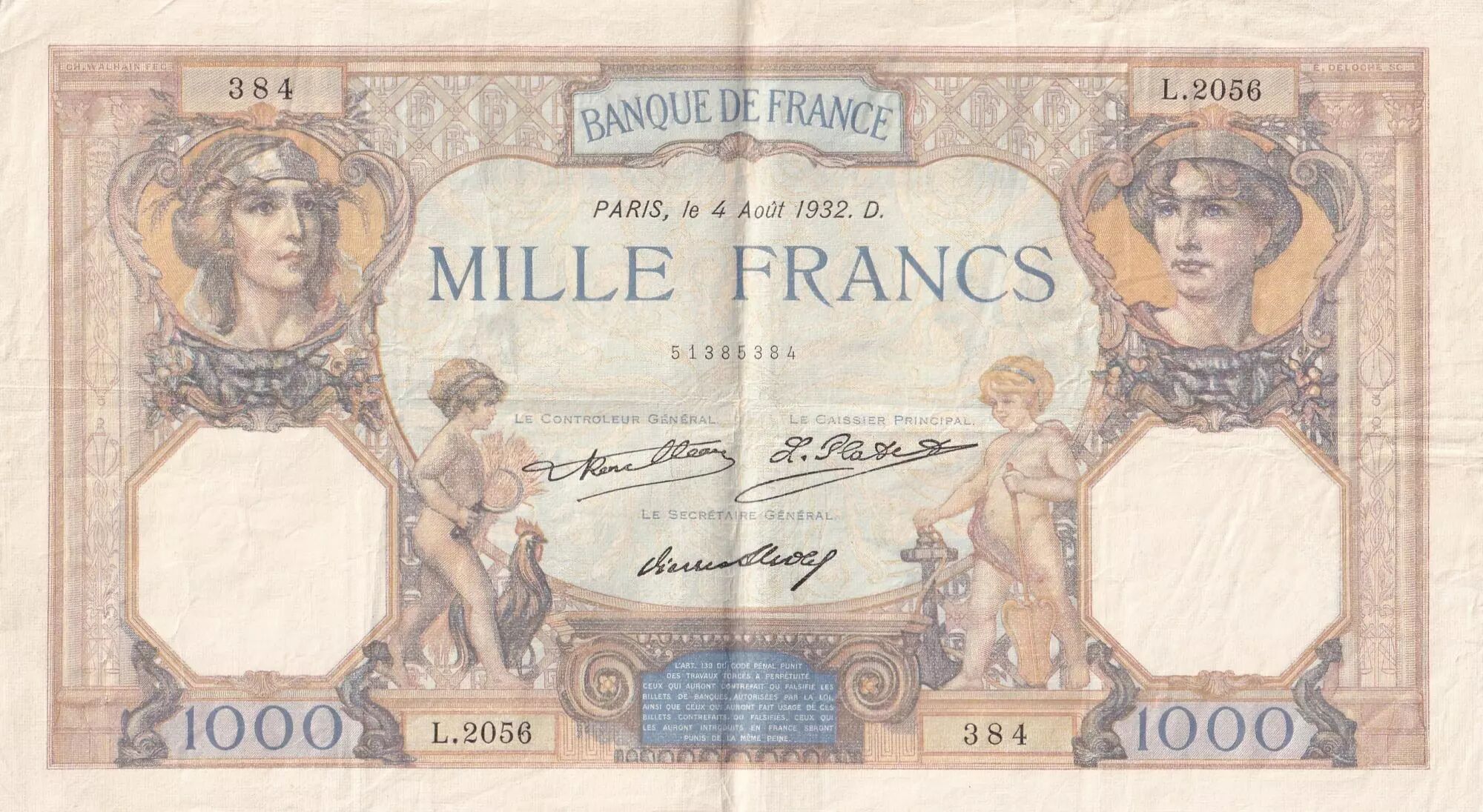 Banknote France 1000 Francs Ceres and Mercury - 04/08/1932 - Serial L.2056