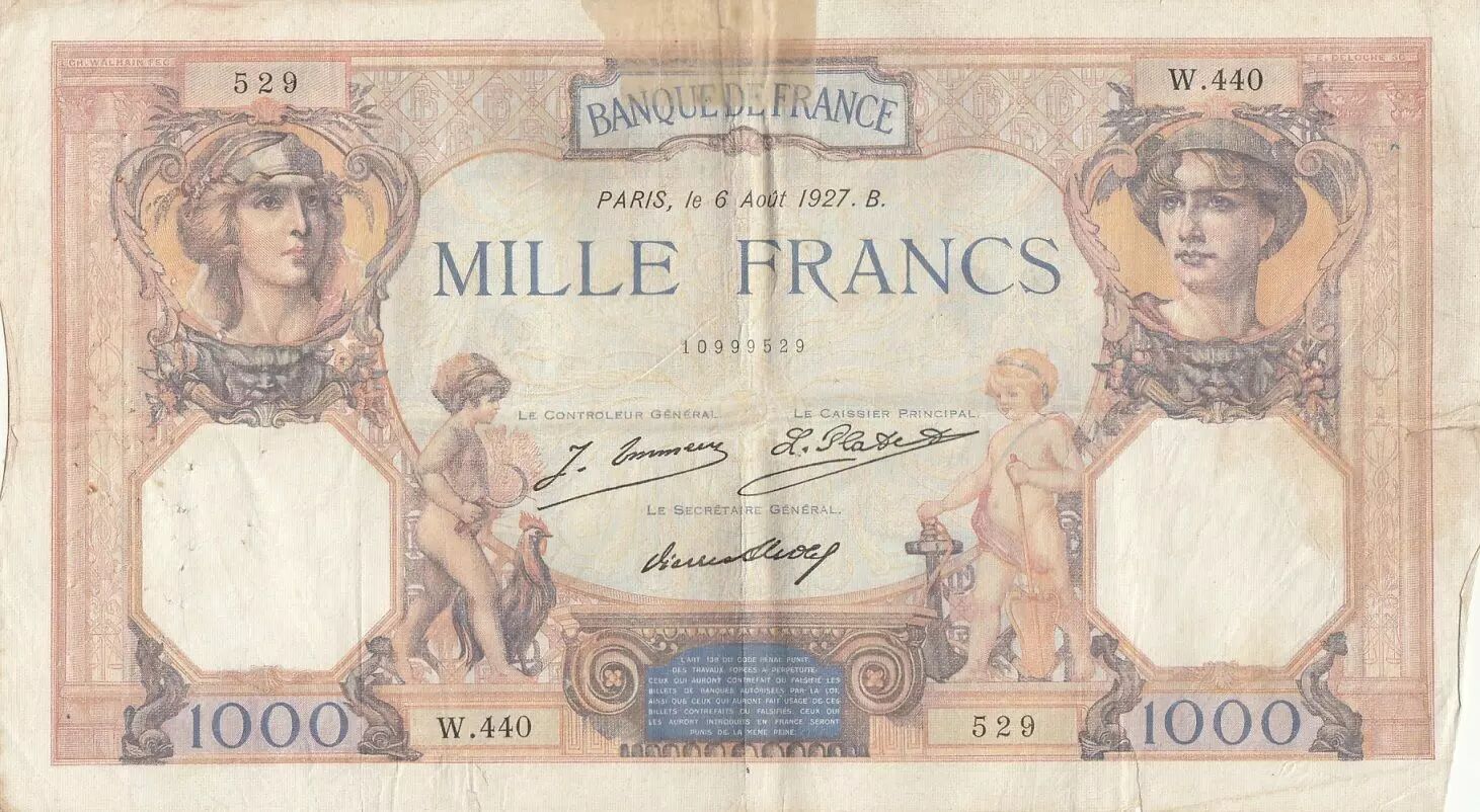 Home > > France 1000 Francs Ceres and Mercury - 06-08-1927 - Serial W.440