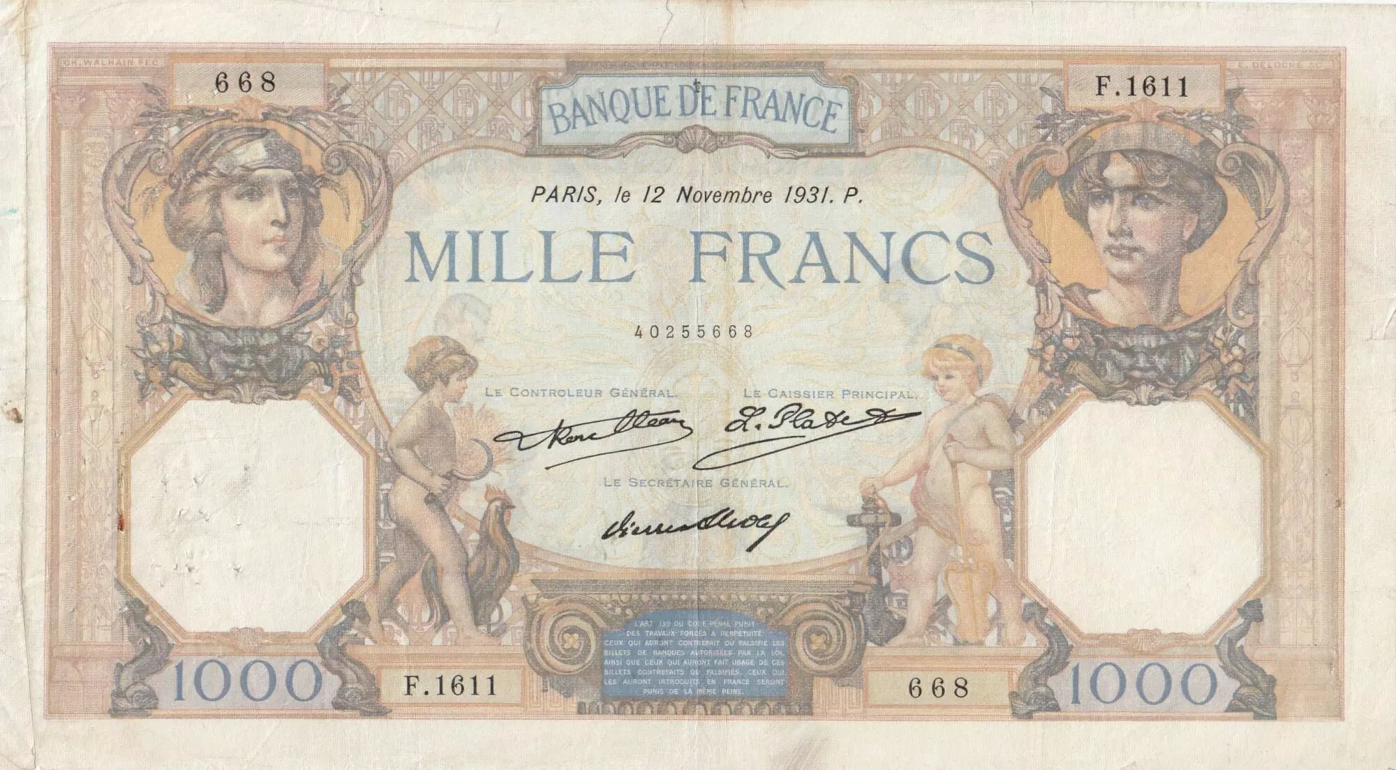 Home > > France 1000 Francs Ceres and Mercury - 12-11-1931 - Serial F.1611