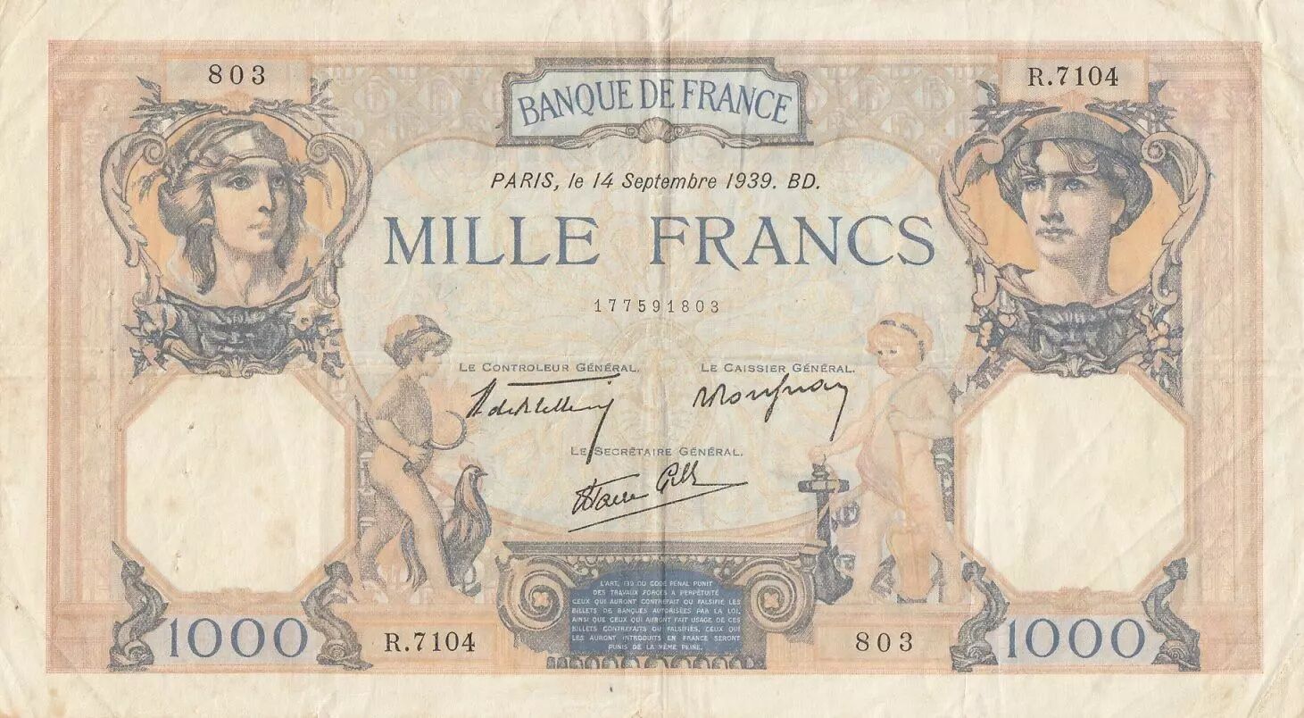 Home > > France 1000 Francs Ceres and Mercury - 14-09-1939 - Serial R.7104
