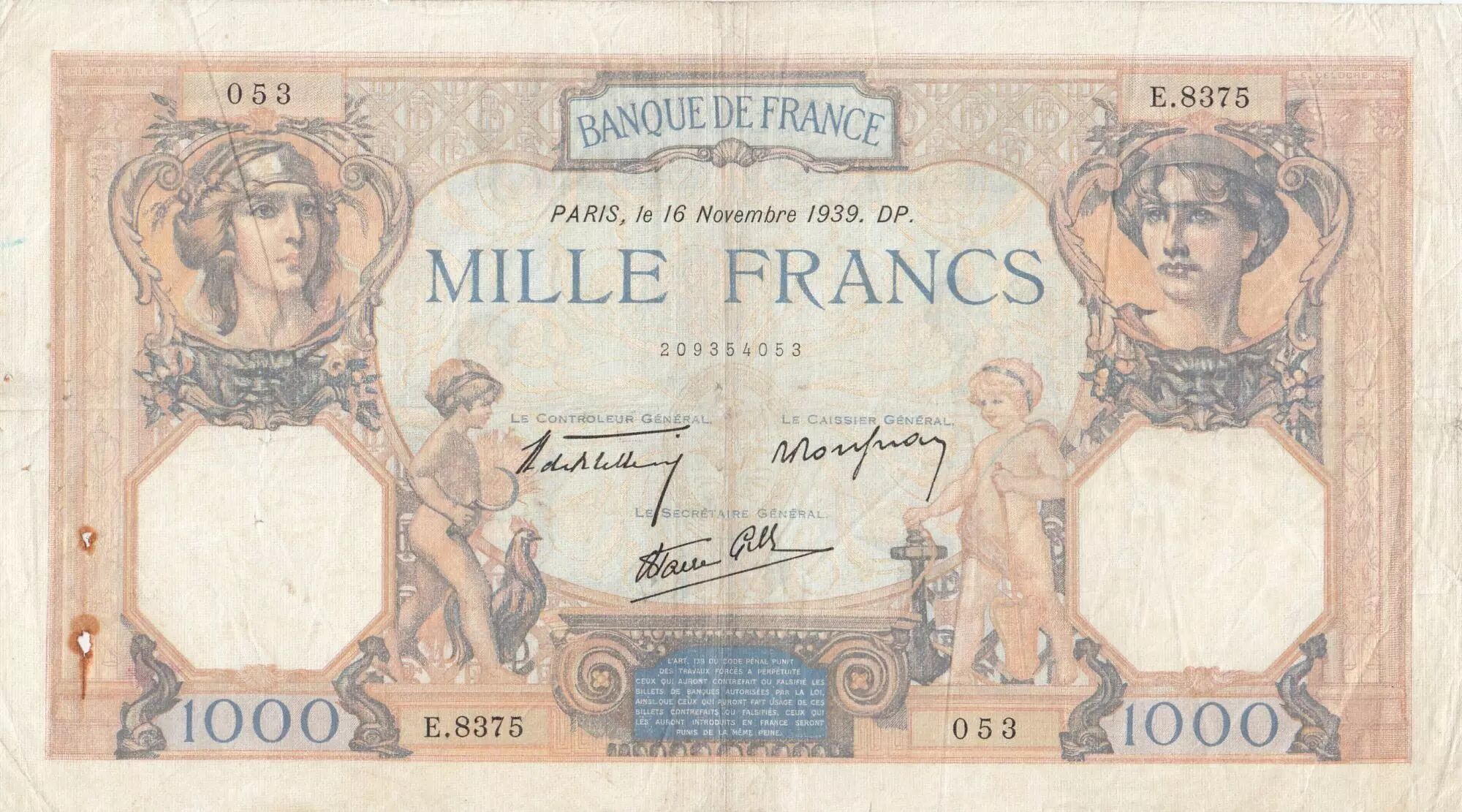 Home > > France 1000 Francs Ceres and Mercury - 16-11-1939 - Serial E.8375
