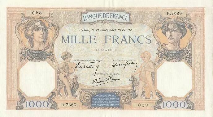 The 1000 Francs Cérès and Mercury banknote, dated September 21, 1939, is a testament to French monetary history. This banknote belongs to series R.7666, which allows it to be precisely identified within the overall issue.
