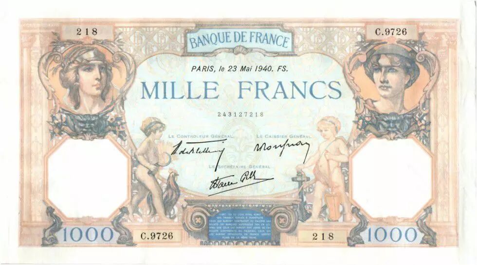 Home > > France 1000 Francs Ceres and Mercury - 23-05-1940 Serial C.9726-218