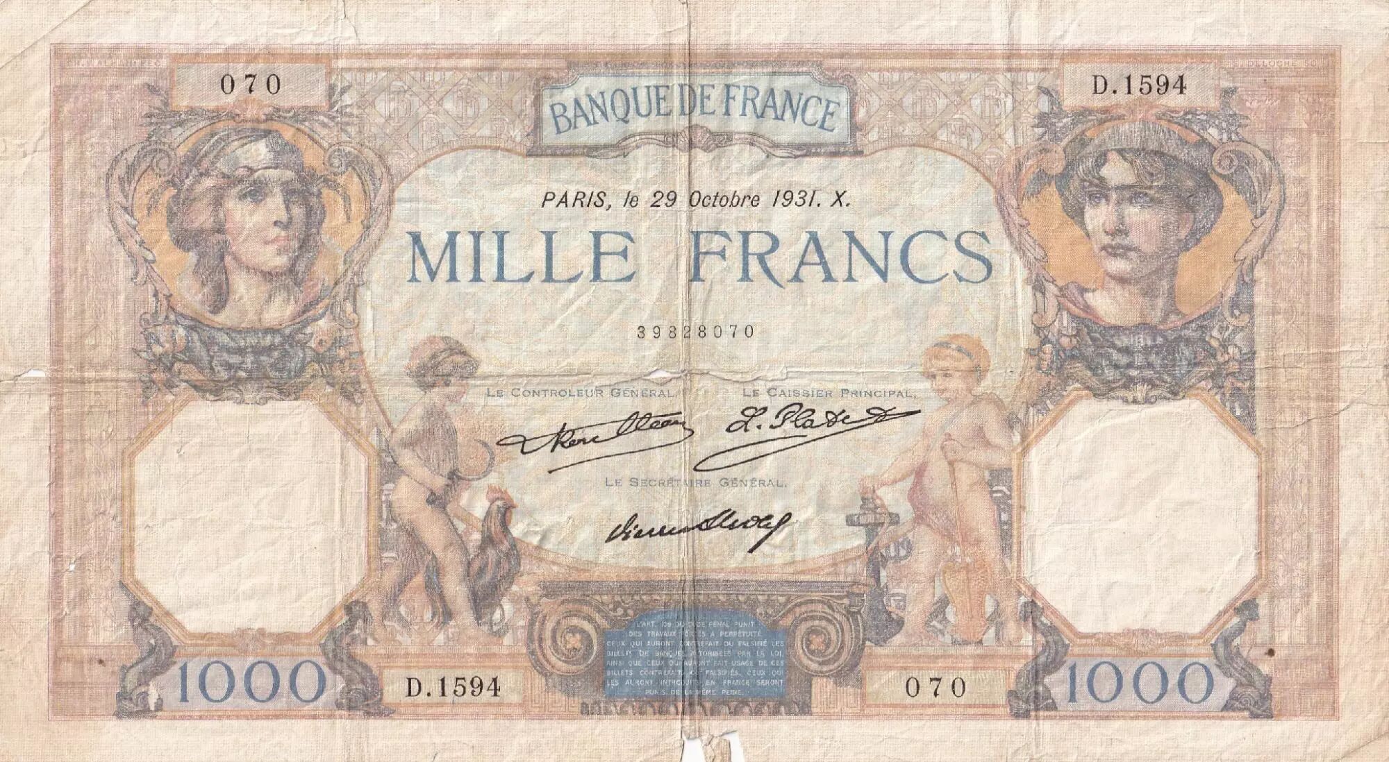 Banknote France 1000 Francs Ceres and Mercury - 29-10-1931 - Serial D.1594