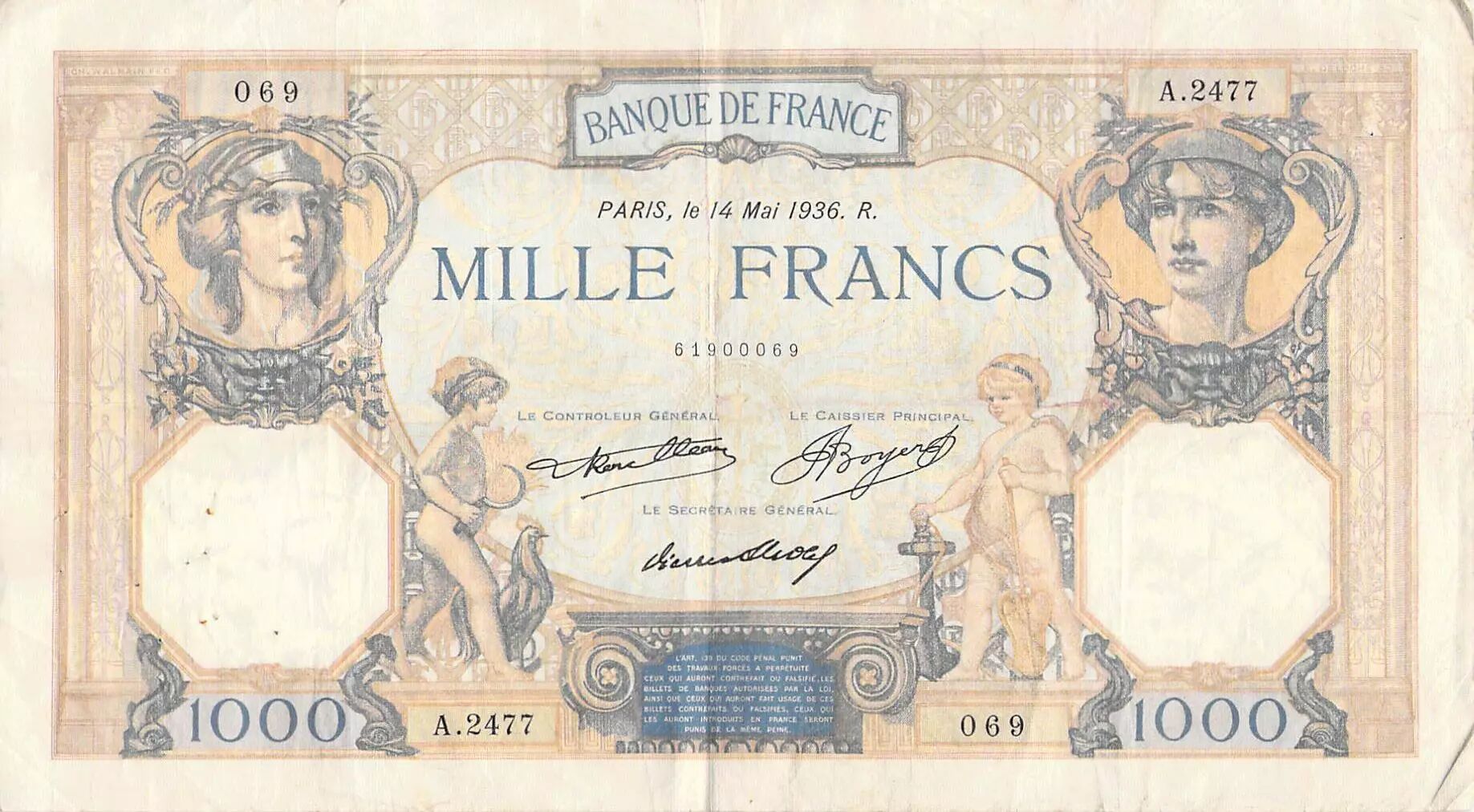 Accueil > Archivage > France 1000 Francs Cérès et Mercure - 14-05-1936 Série A.2477 - TTB