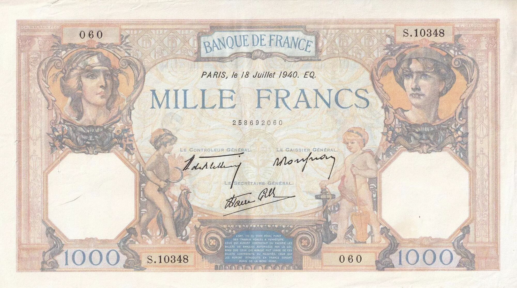 Accueil > Billets Français > Billets Banque de France > Billets 1000 francs > Cérès et Mercure type 1927 (1927-1940) > France 1000 Francs - Cérès et Mercure - 18-07-1940 - Série S.10348 - F.38.50