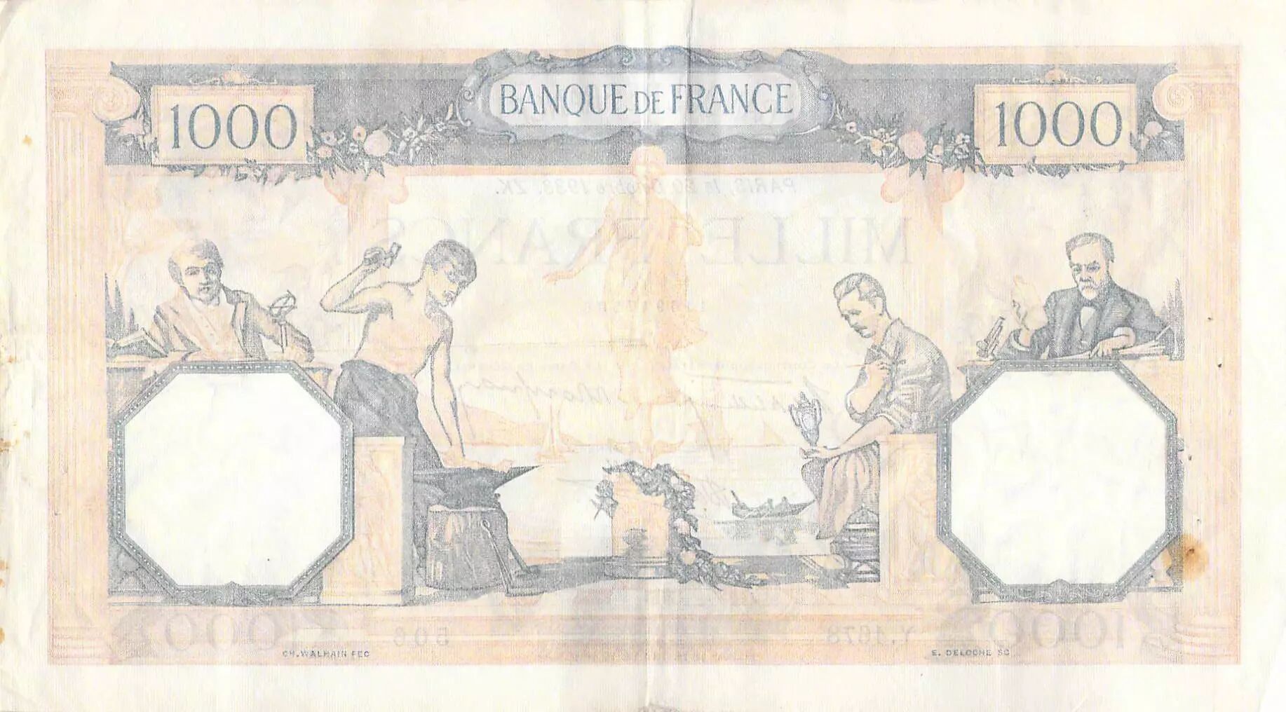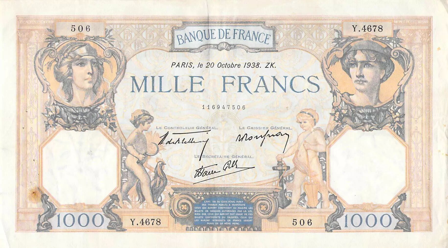 Accueil > Archivage > France 1000 Francs Cérès et Mercure - 20-10-1938 Série Y.4678 - TTB
