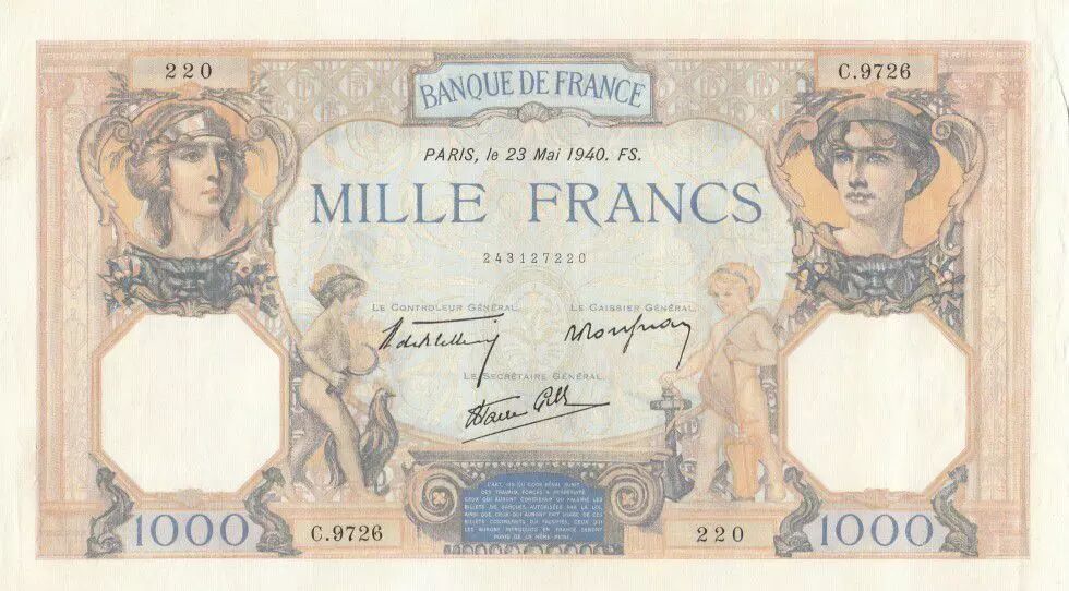 Accueil > Archivage > archivage-Archivage > France 1000 Francs Cérès et Mercure - 23-05-1940 Série C.9726-220