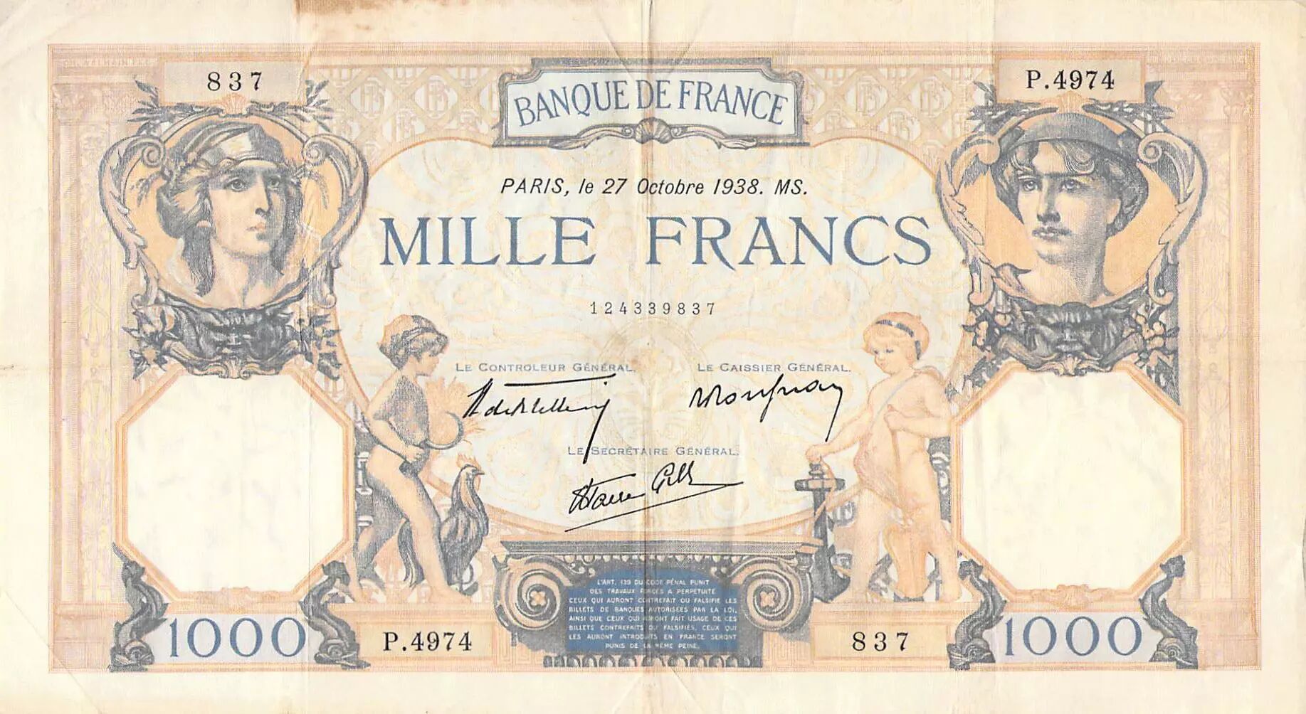 Accueil > Archivage > France 1000 Francs Cérès et Mercure - 27-10-1938 Série P.4974 - TTB
