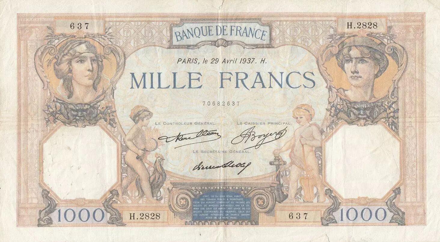 Accueil > Archivage > archivage-Billets Français > France 1000 Francs Cérès et Mercure - 29-04-1937 - Série H.2828
