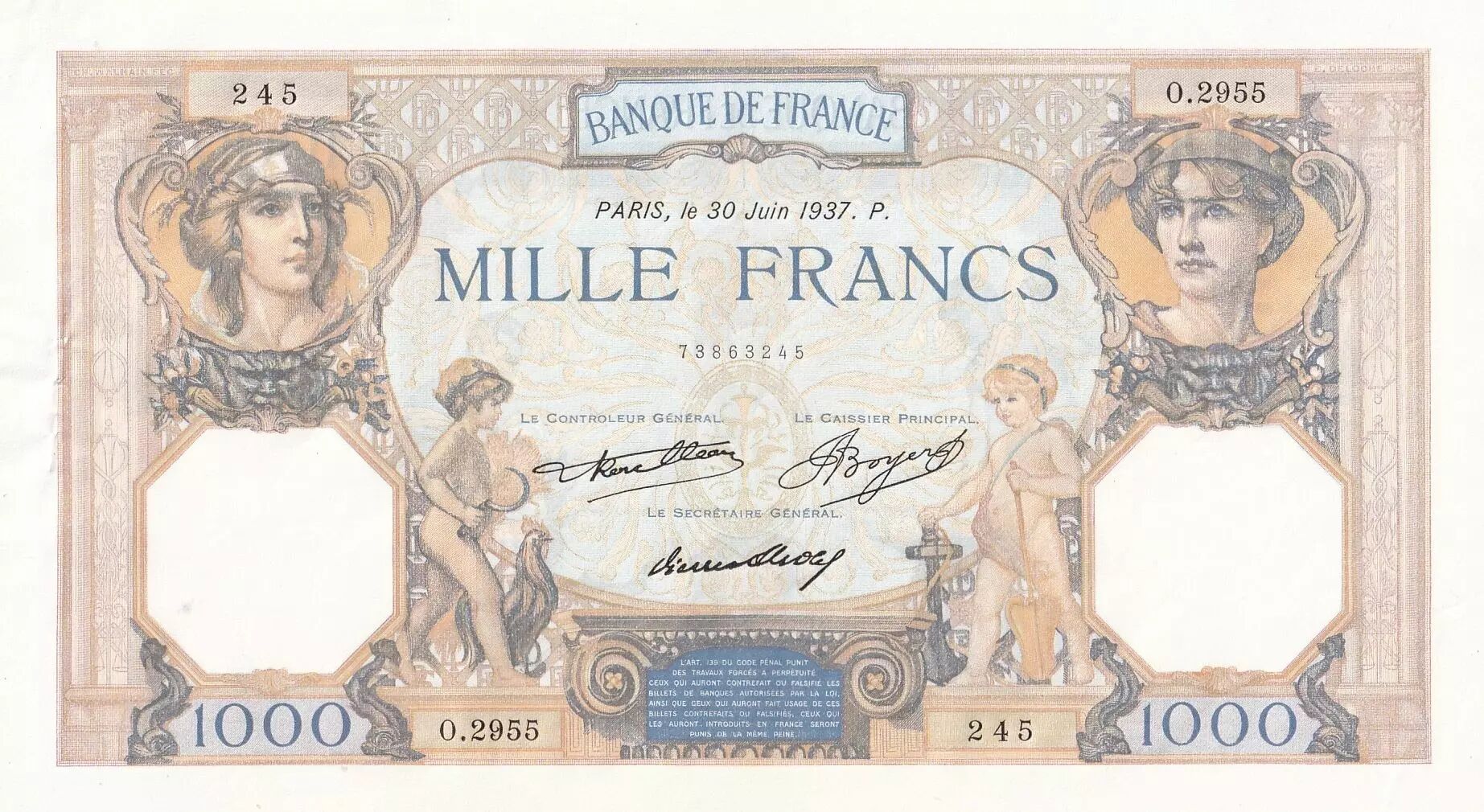 Accueil > Billets Français > Billets Banque de France > Billets 1000 francs > Cérès et Mercure type 1927 (1927-1940) > France 1000 Francs Cérès et Mercure - 30-06-1927 - Série O.2955 - dernière date
