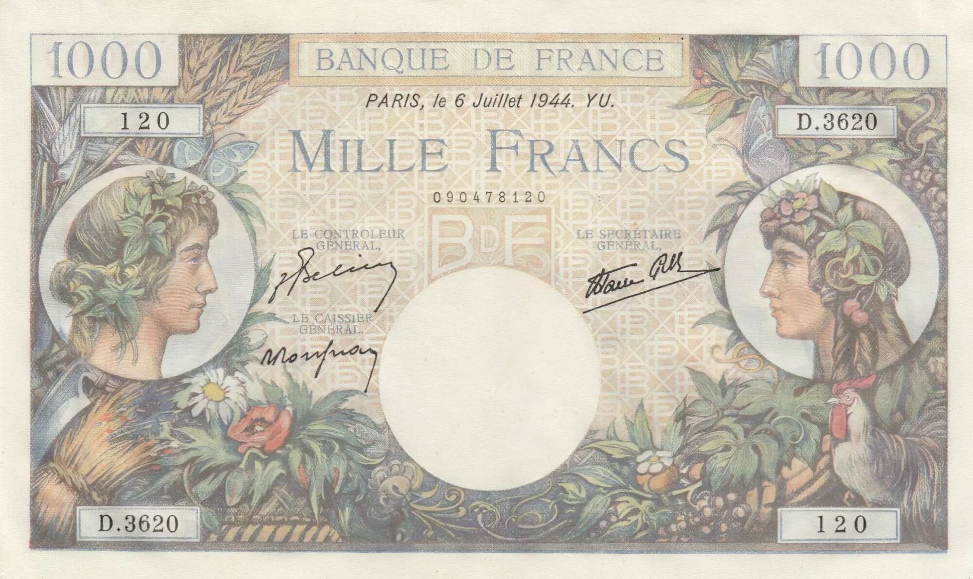 Banknote France 1000 Francs - Commerce and Industry - 06-07-1944 Serial D.3620