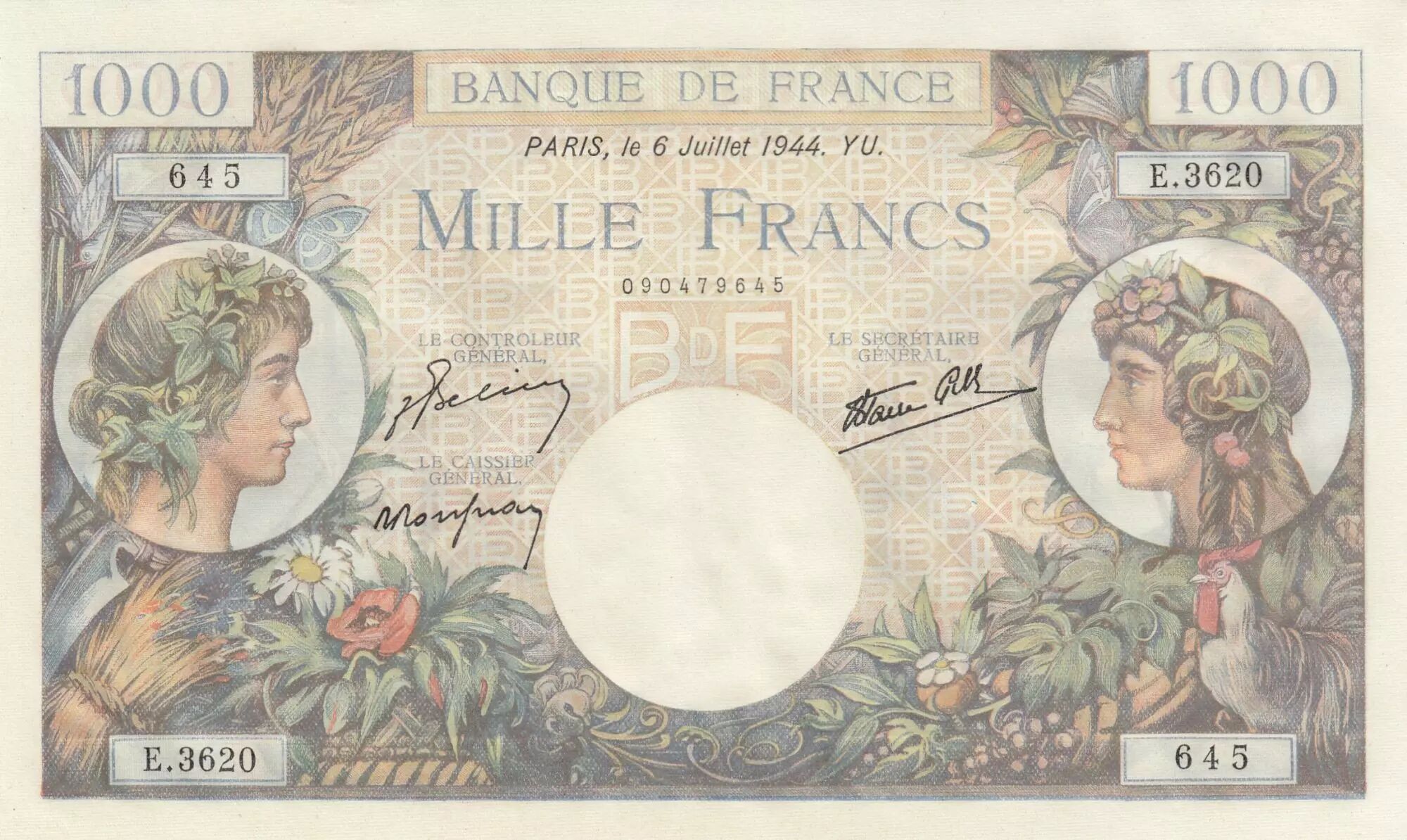 Banknote France 1000 Francs - Commerce and Industry - 06-07-1944 Serial E.3620