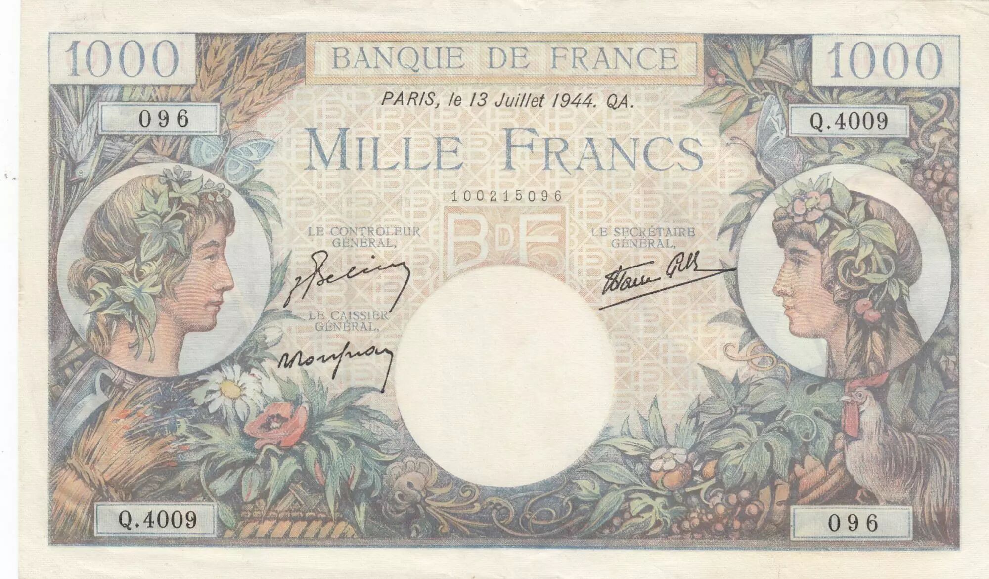 Banknote France 1000 Francs Commerce and Industry - 13-07-1944 Serial Q.4009