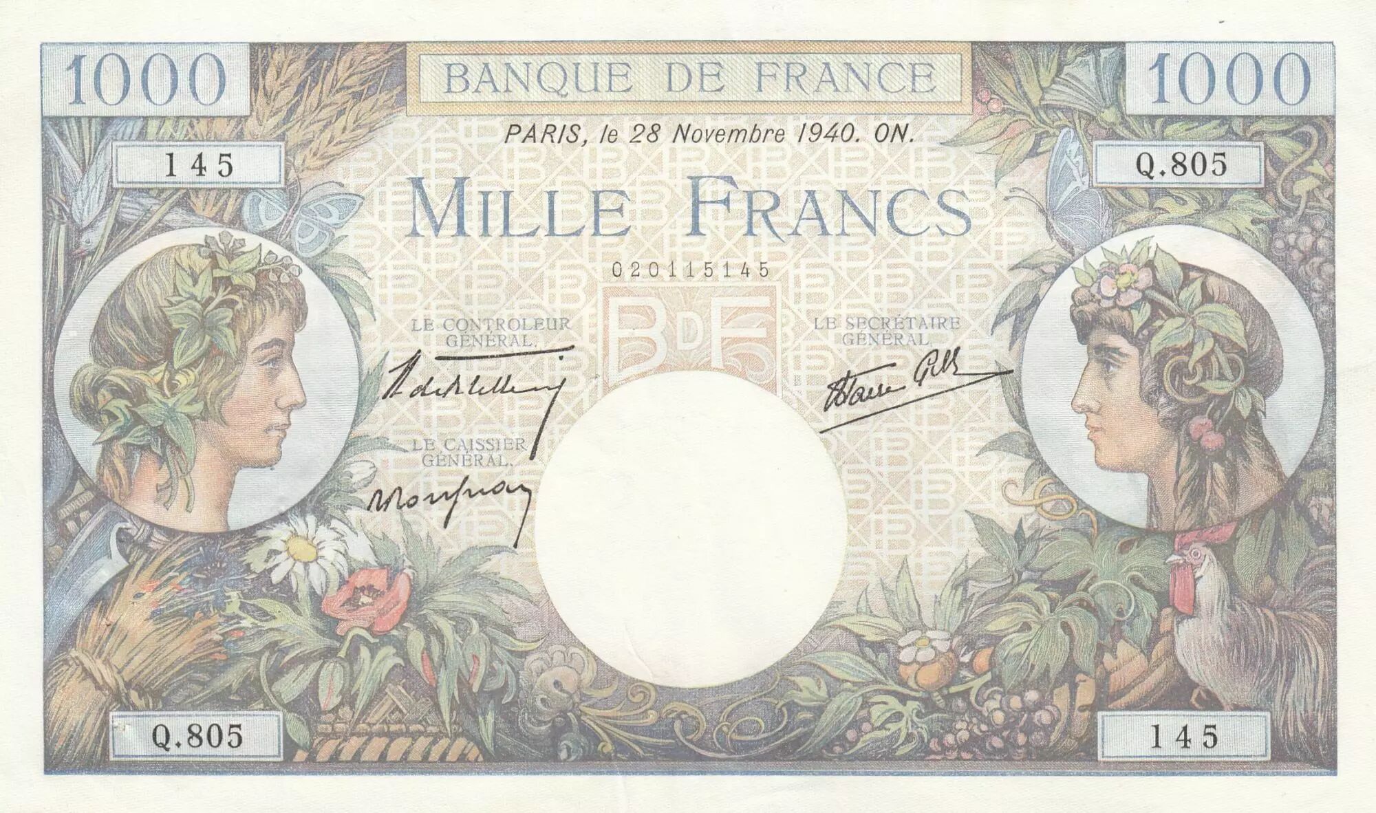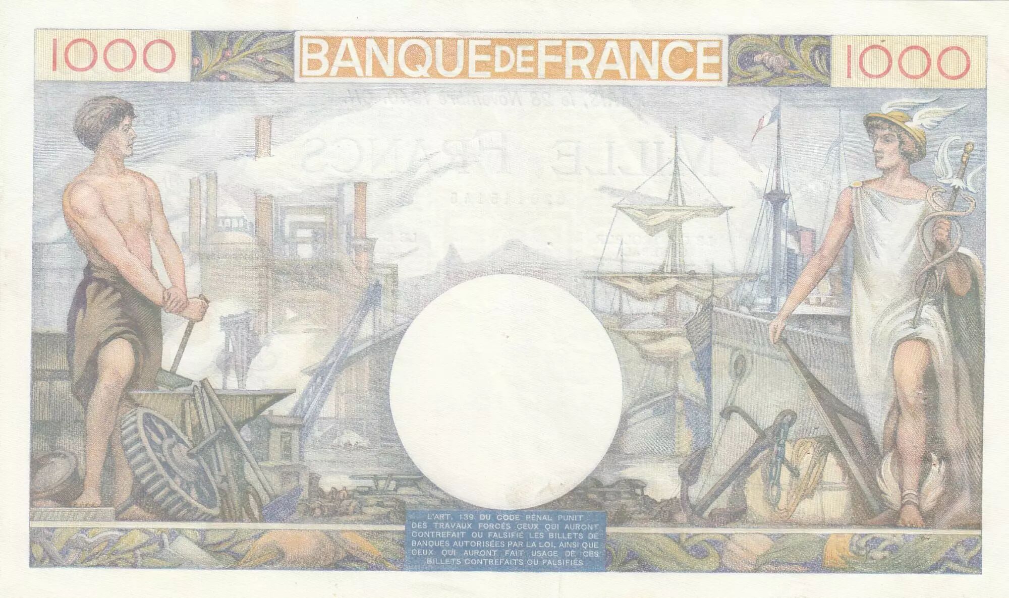 Home > > France 1000 Francs - Commerce and Industry - 28-11-1940 - Serial Q.805 - P.96a