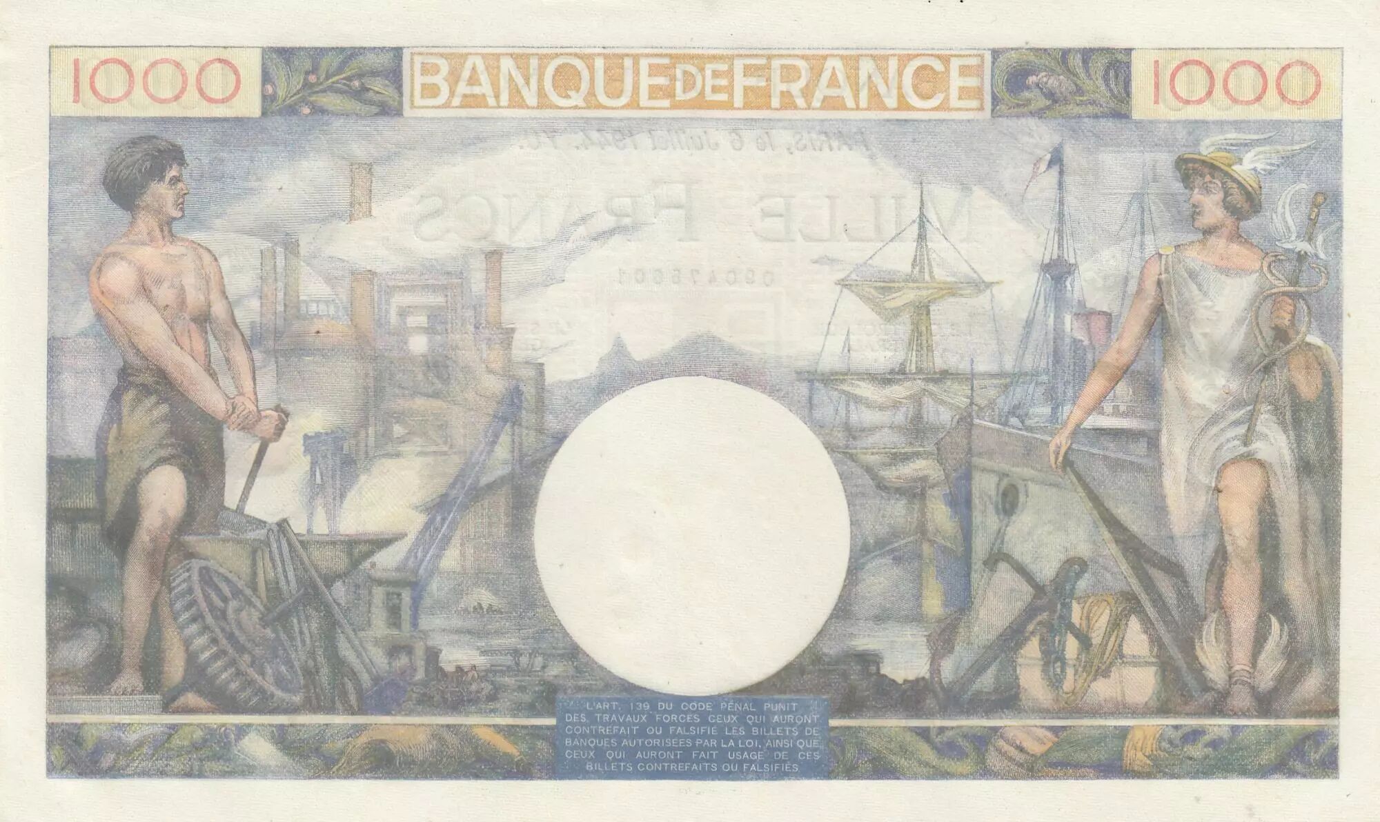 Billet France 1000 Francs Commerce et Industrie - 06-07-1944 - Série A.3620