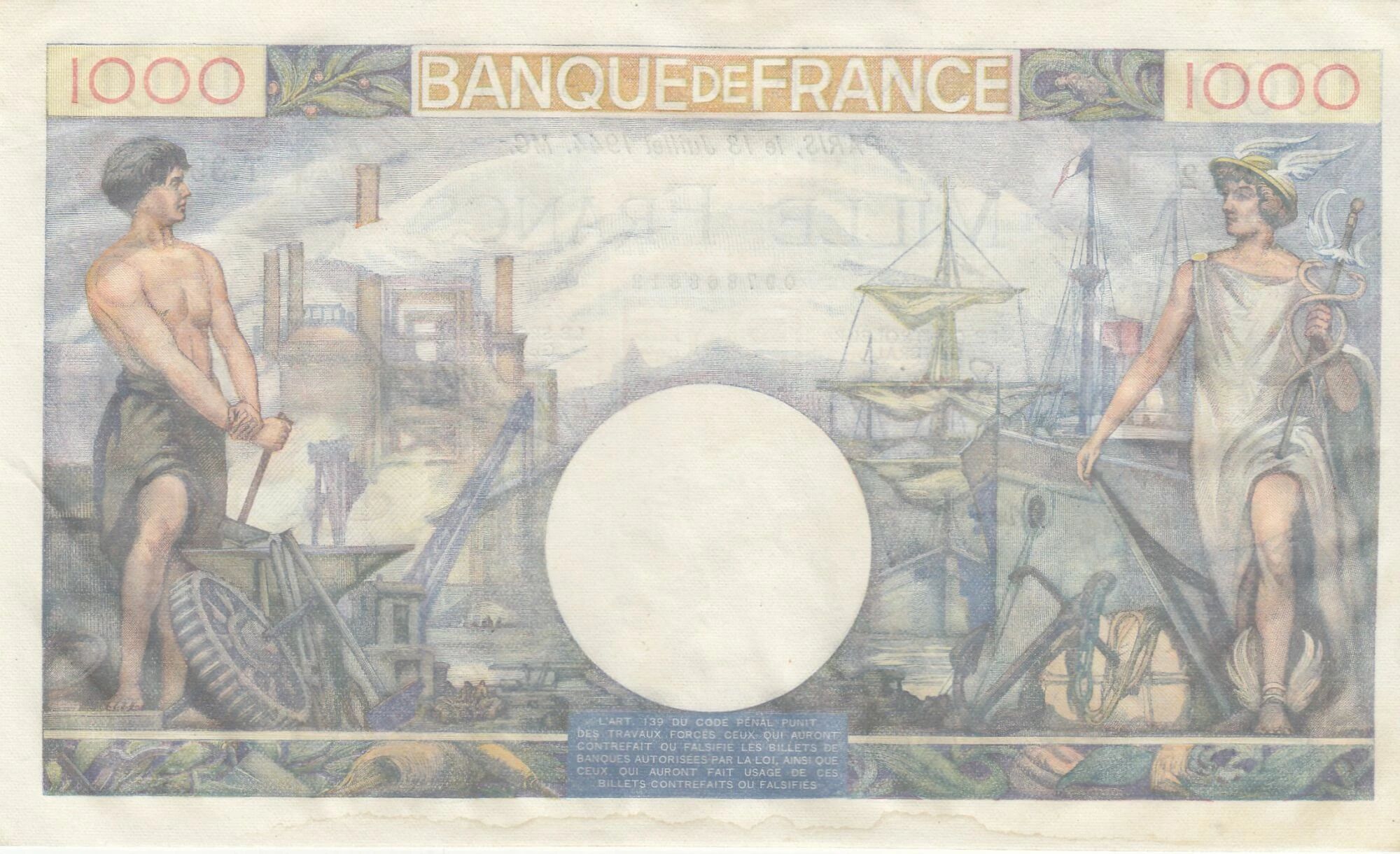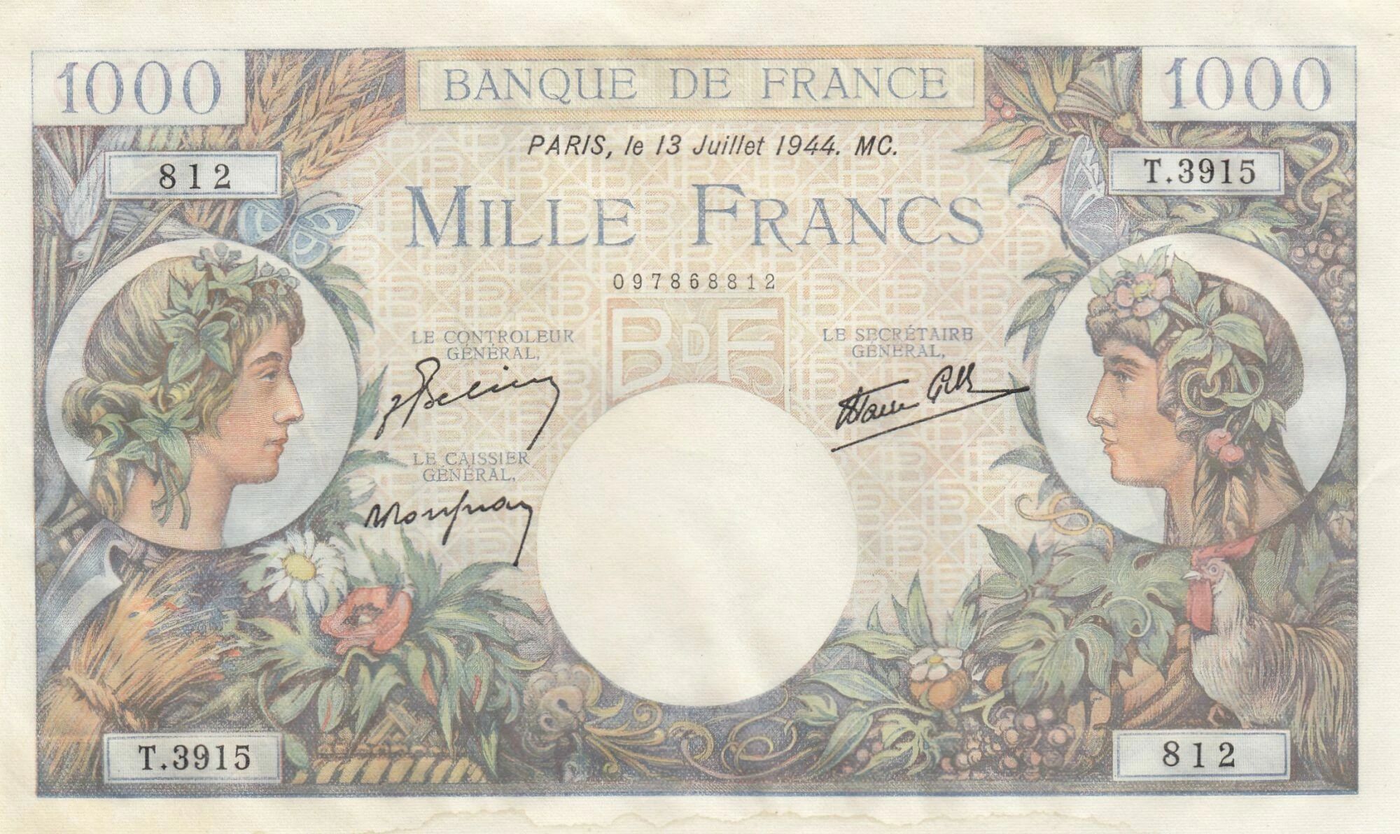Ce billet de banque français a une valeur nominale de 1000 francs. Il a été émis le 13 juillet 1944 et porte la série T.3915.