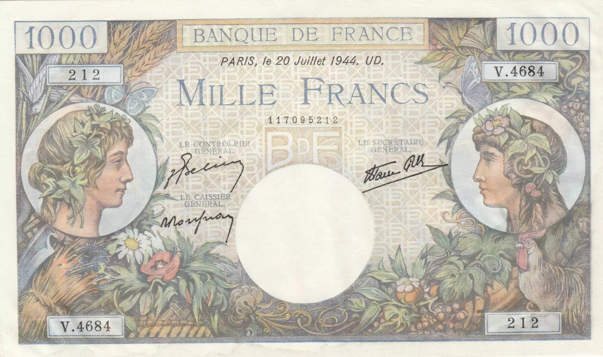 Le billet de 1000 francs, émis par la Banque de France en 1944, incarne une période spécifique de l'histoire économique et sociale française. Ce billet, daté du 20 juillet 1944, appartient à la série V.4684.