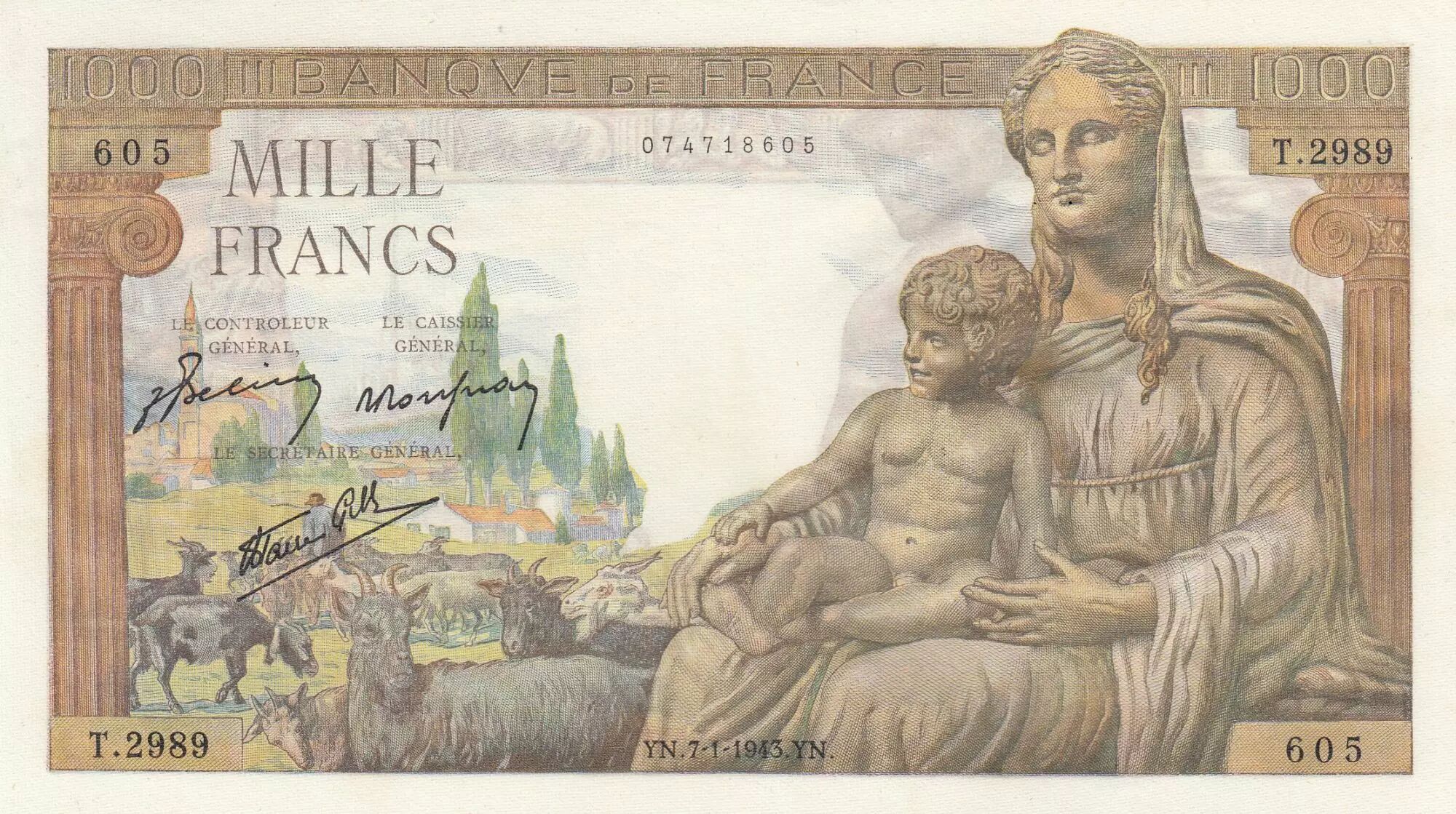 Billet France 1000 Francs - Déesse Déméter - 07-01-1943 - Série T.2989