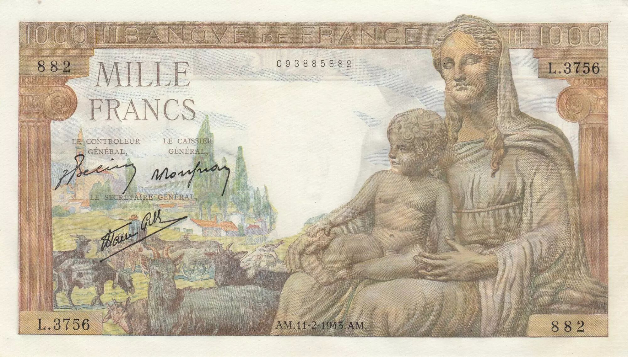 Banknote France 1000 Francs - Deesse Demeter - 11-02-1943 - Serial L.3756