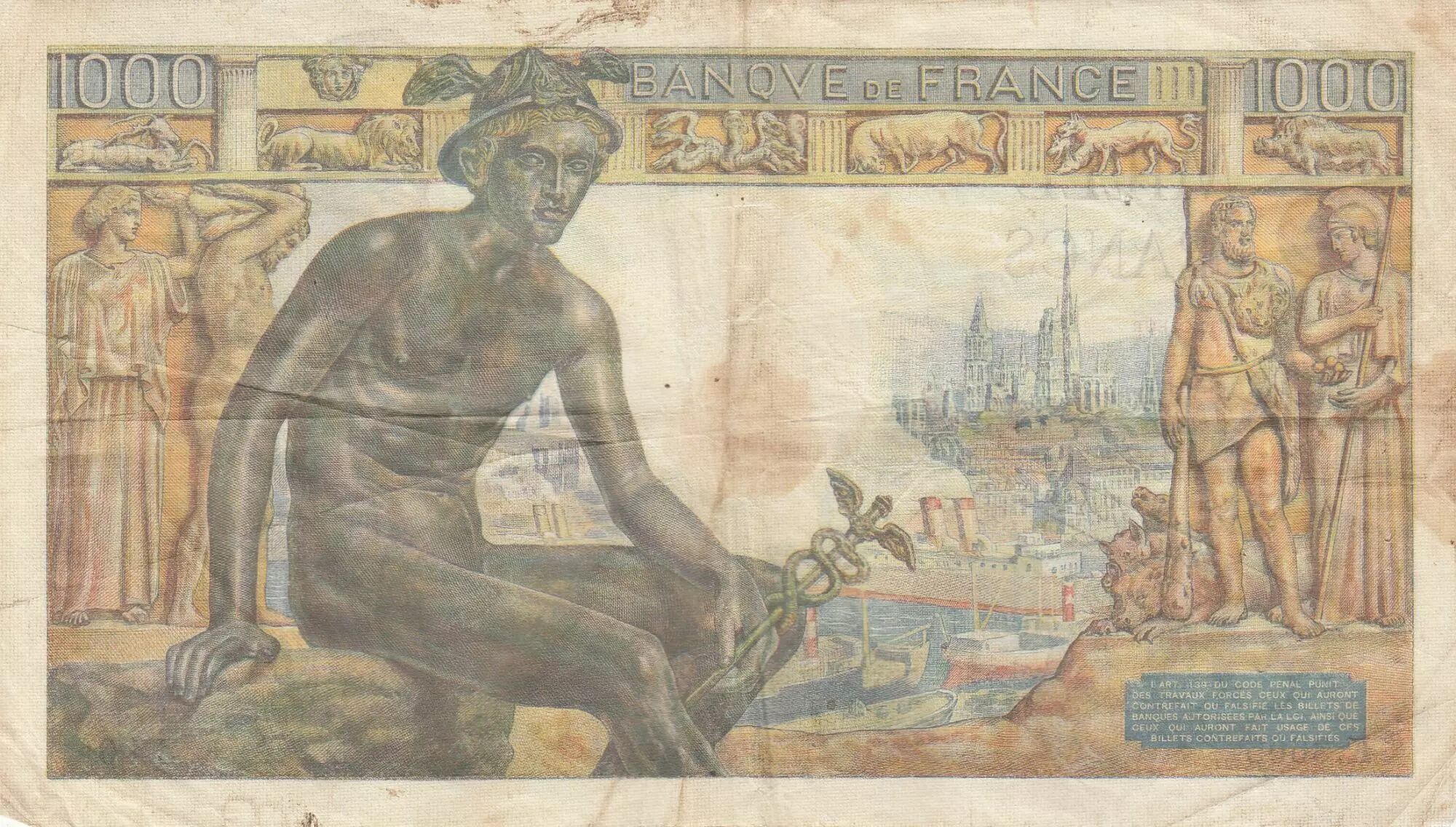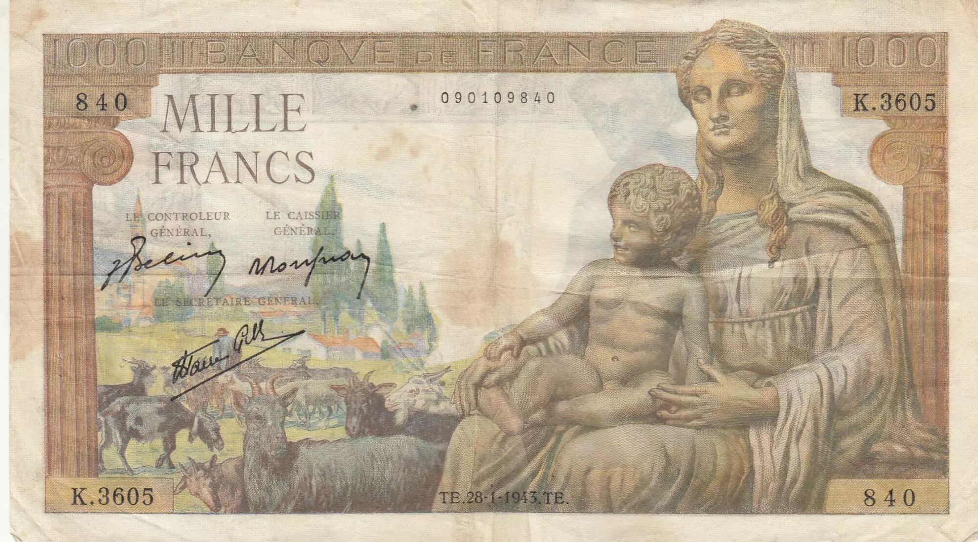 Ce billet de banque français d'une valeur nominale de 1000 francs a été émis en 1943. Il appartient à la série K.3605. Les dimensions du billet sont de 190 millimètres de longueur pour 115 millimètres de largeur.