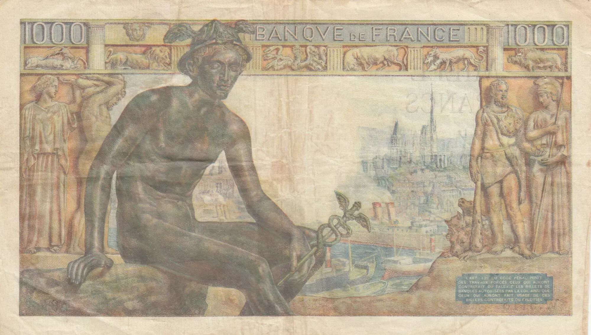 Le billet de 1 000 francs français, connu sous le nom de « Déméter et Hercule », mesure 190 × 115 mm et se distingue par la richesse de son iconographie inspirée de la mythologie grecque. Sur son recto, une statue de Déméter est représentée assise à droite, tenant l?enfant Hercule sur ses genoux. À gauche, un paysage provençal animé par un berger et son troupeau de chèvres évoque la fertilité et la vie rurale. Les inscriptions en alphabet latin indiquent « 1000 BANQVE DE FRANCE 1000 » et « MILLE FRANCS ».