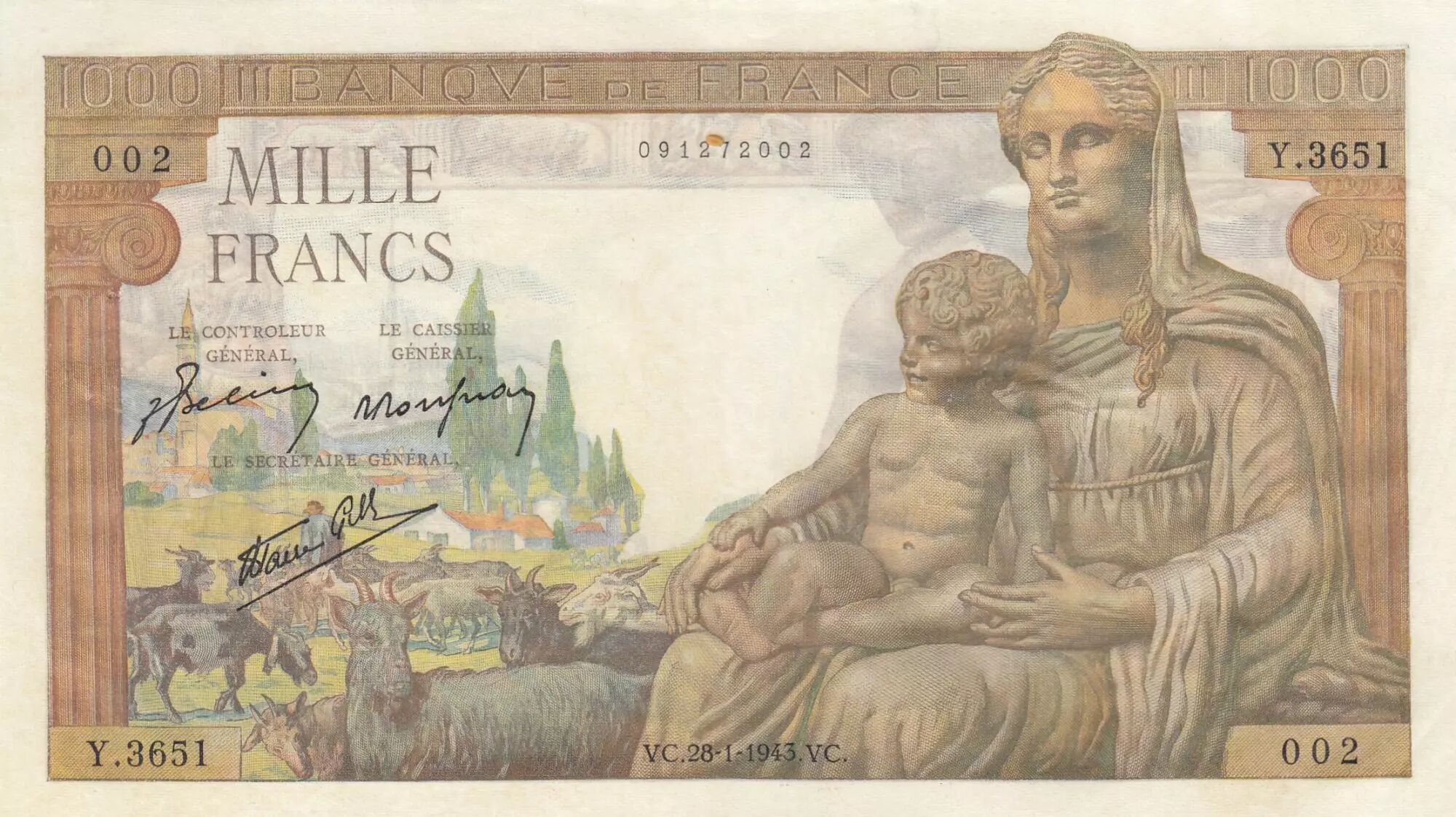 This French banknote with a nominal value of 1000 francs was issued in 1943. It belongs to the Y.3651 series. The banknote's dimensions are 190 millimeters in length and 115 millimeters in width.