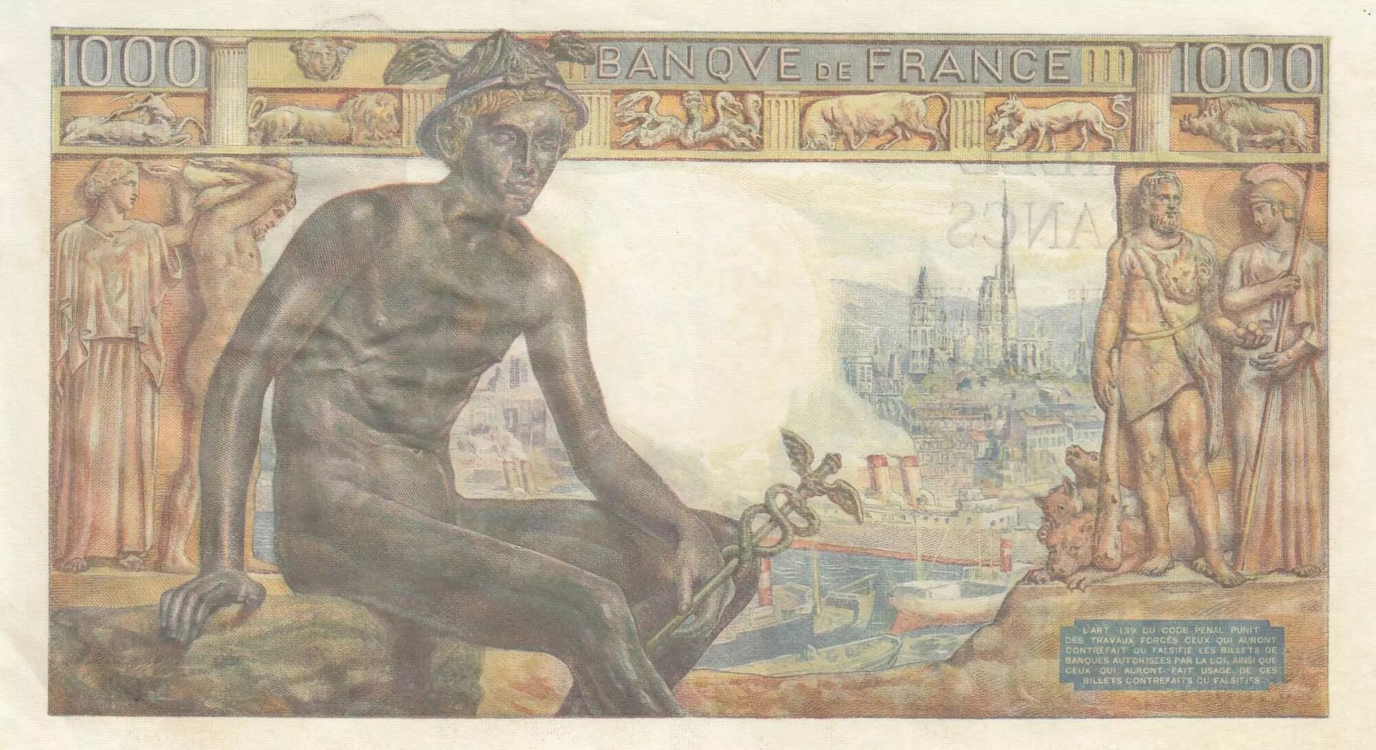 The back of the banknote features a statue of Mercury on the left, accompanied by representations of the labors of Hercules. On the right, Hercules is depicted subduing Cerberus and offering Minerva the golden apples from the Garden of the Hesperides. Deianira is also depicted, taking Atlas' place to support the world. A port and the city of Rouen are visible in the background. Legal mentions relating to article 139 of the Penal Code concerning the counterfeiting of banknotes are also included. Marguerite Dreyfus, also known as Rita, is the engraver of this part of the banknote, and Lucien Hector Jonas is the designer.