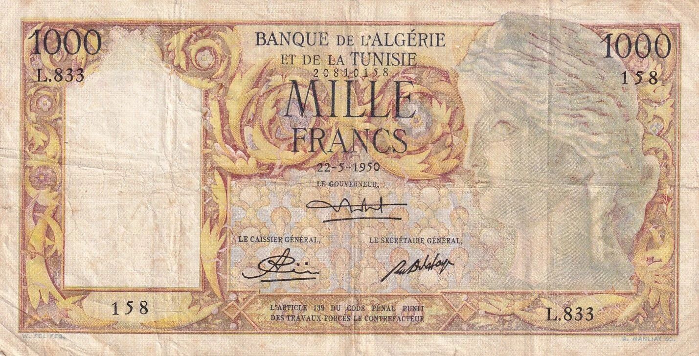 Il s'agit d'un billet de banque de 1000 francs émis par la Banque de l'Algérie. Ce billet a été émis le 22 mai 1950, avec la série L.833. Il s'inscrit dans la période de la colonie française, entre 1830 et 1962, et plus précisément dans les dates d'émission allant de 1949 à 1958.