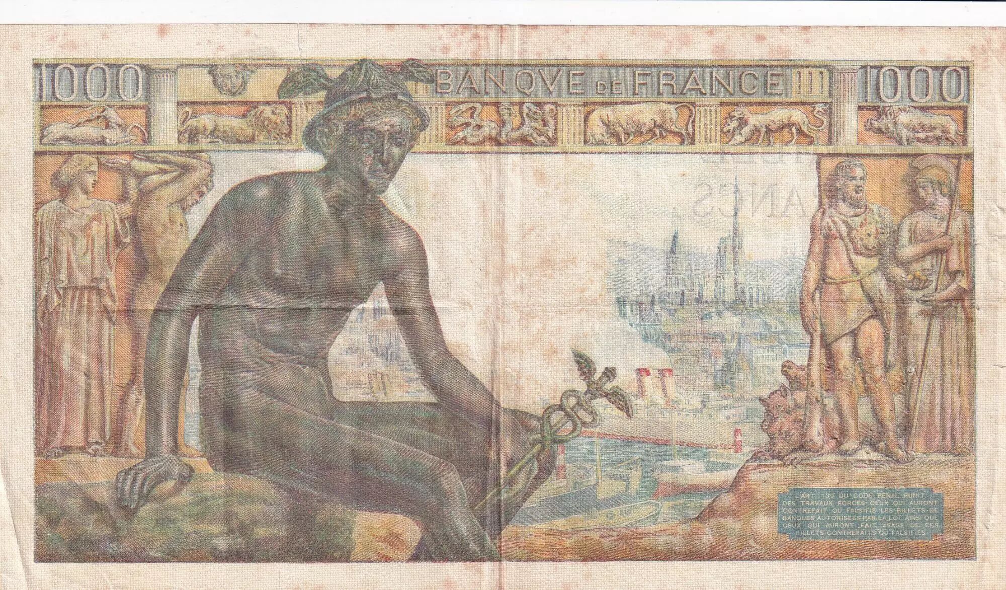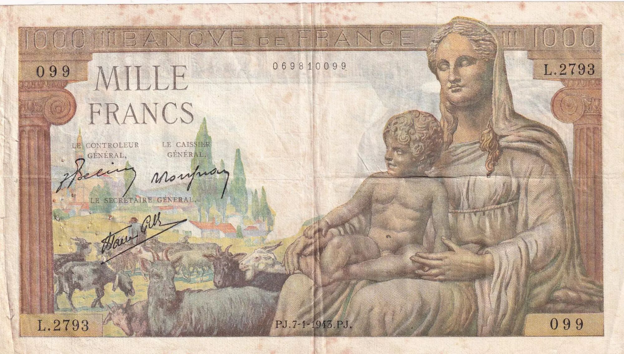 Home > > France 1000 Francs Goddess Demeter - 07-01-1943 - Serial L.2793