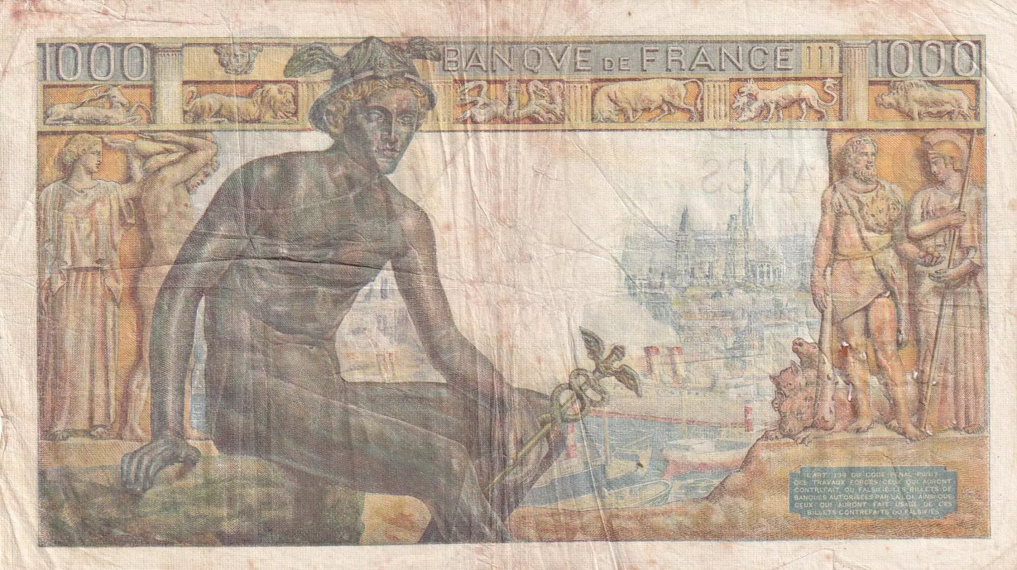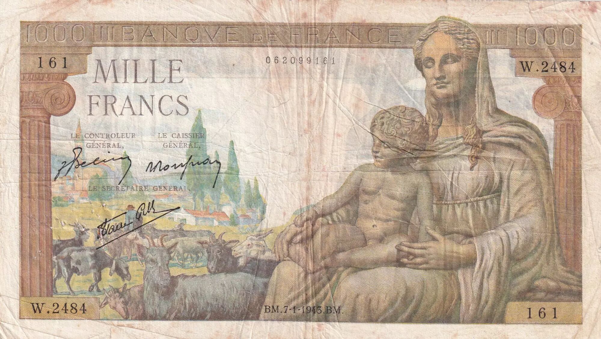 Banknote France 1000 Francs Goddess Demeter - 07-01-1943 - Serial W.2484