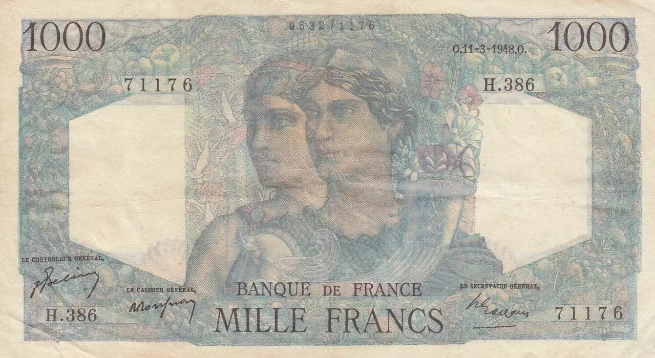 Banknote France 1000 Francs Minerva and Hercules - 11-03-1948 - Serial H.386