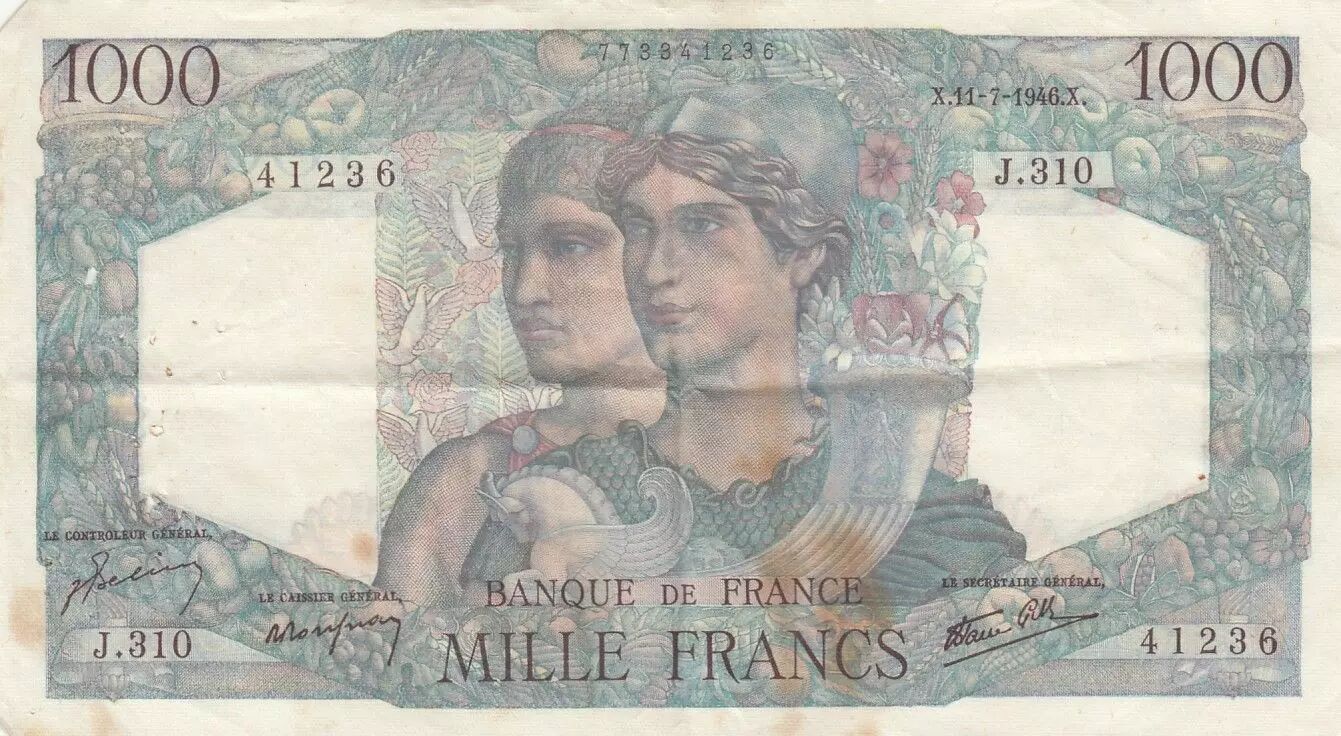 Banknote France 1000 Francs Minerva and Hercules - 11-07-1946 - Serial J.310
