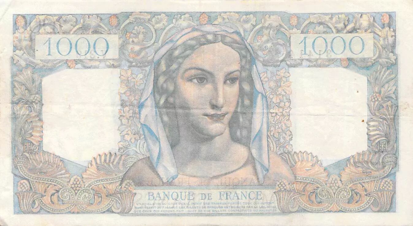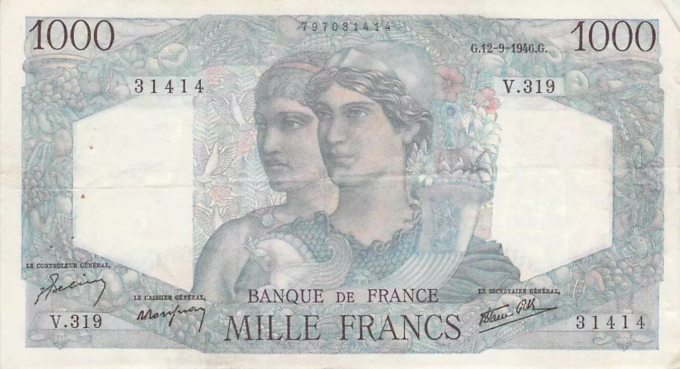 Banknote France 1000 Francs Minerva and Hercules - 12-09-1946 Serial V.319 - VF