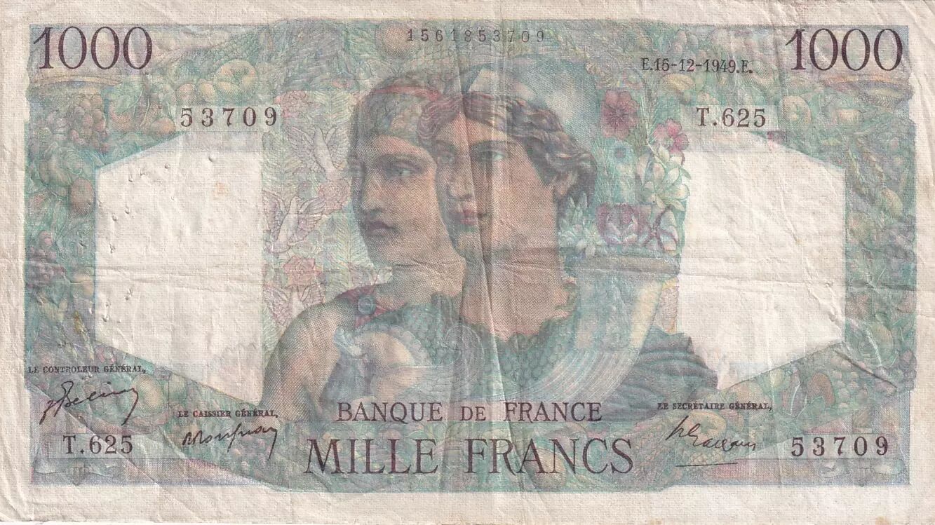 Home > French Banknotes > Bank of France Banknotes > 1000 Francs Banknotes > Minerva and Hercules Type 1945 (1945-1950) > France 1000 Francs Minerva and Hercules - 15-12-1949 - Serial T.625 - F.41.30