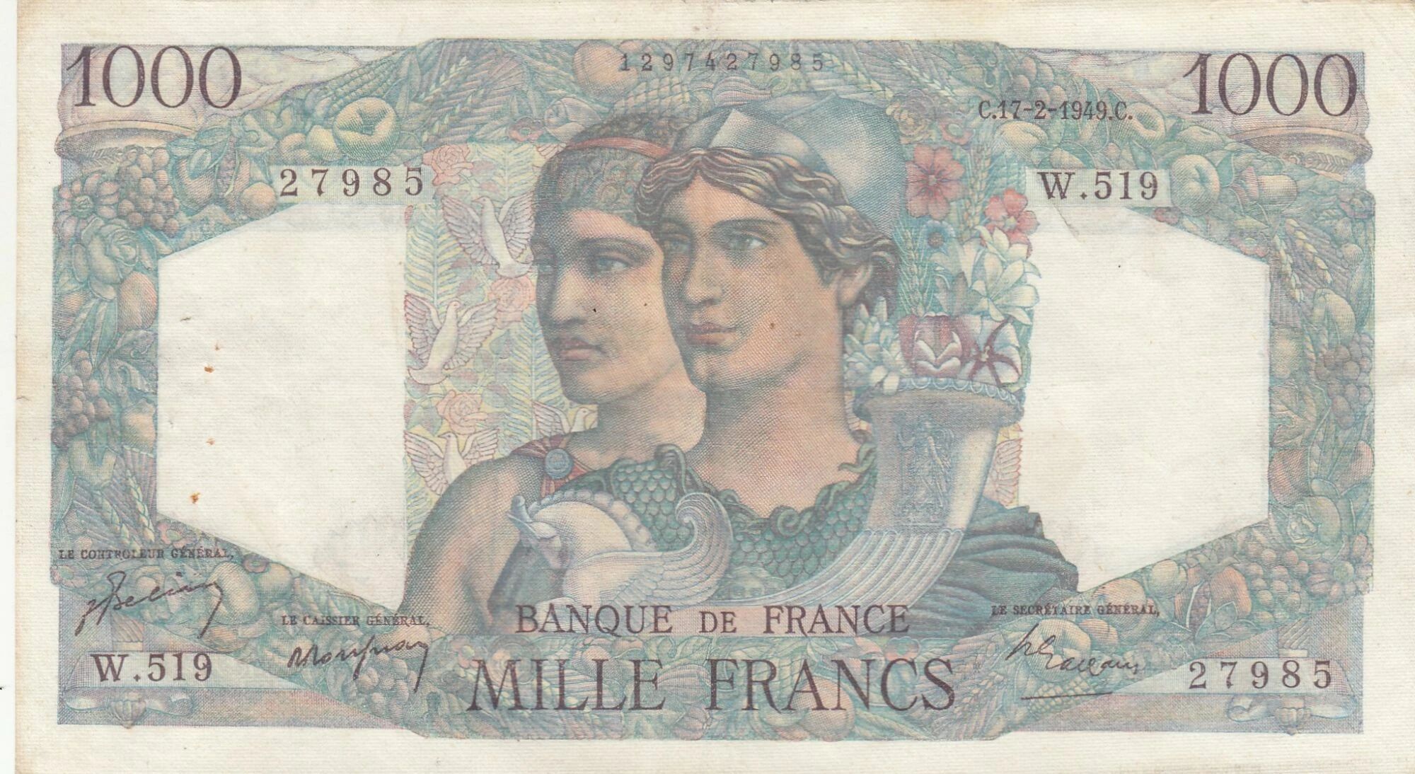 This French banknote has a face value of 1000 francs. It was issued in France on February 17, 1949.