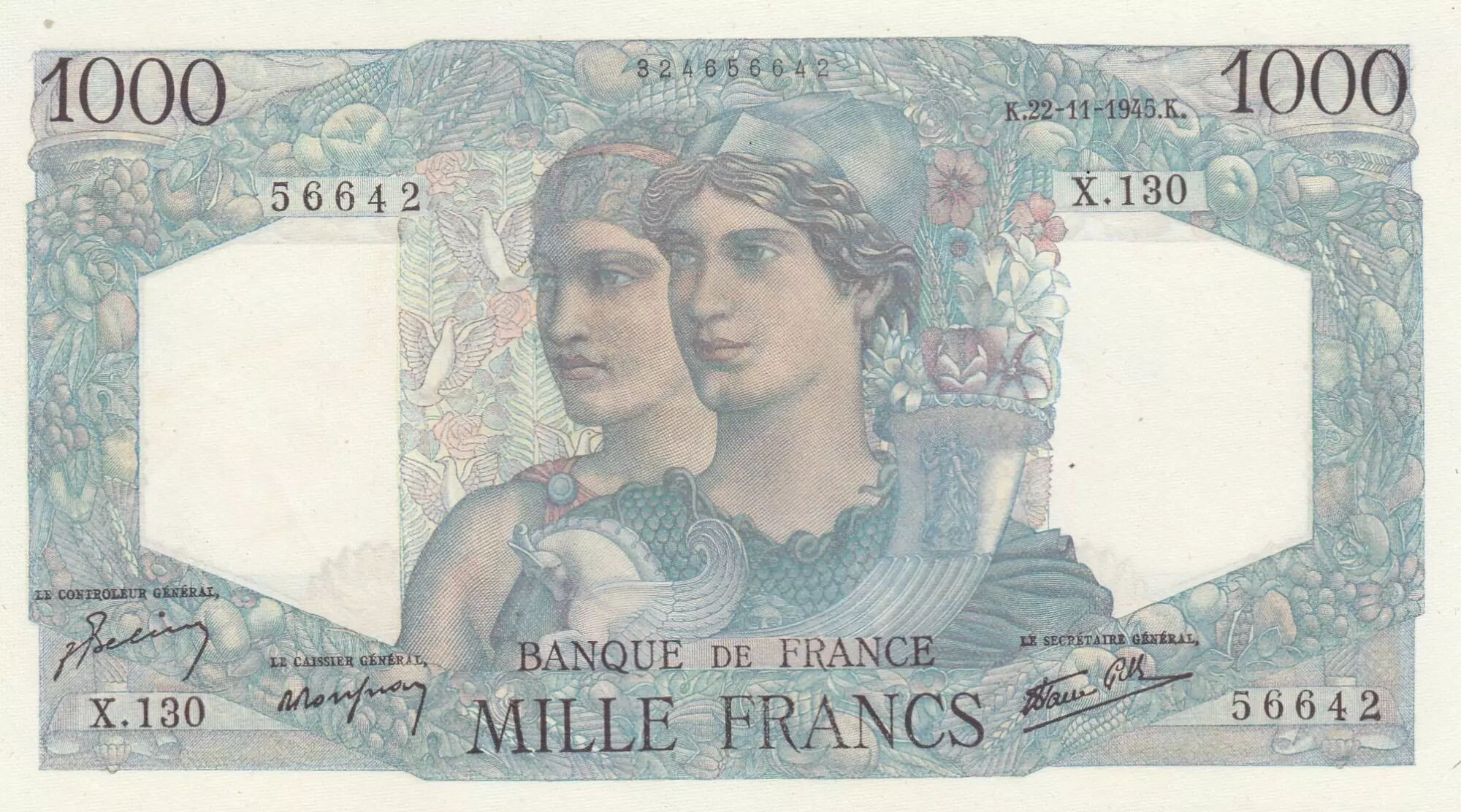 Banknote France 1000 Francs - Minerva and Hercules - 22-11-1945 - Serial X.130