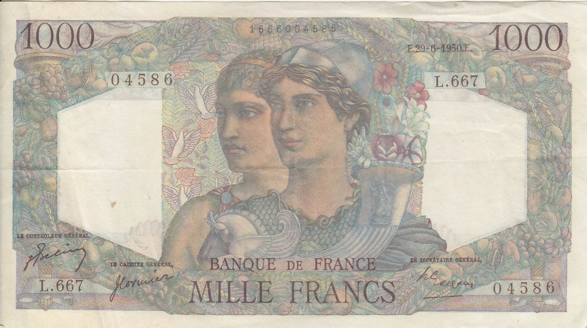 Banknote France 1000 Francs - Minerva and Hercules - 29-06-1950 - Serial L.667