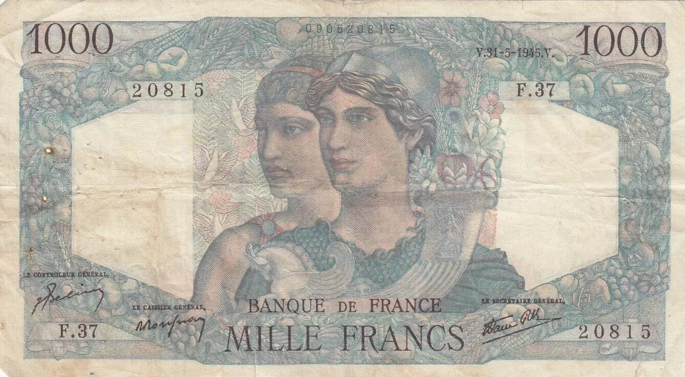 Banknote France 1000 Francs Minerva and Hercules - 31-05-1945 - Serial F.37