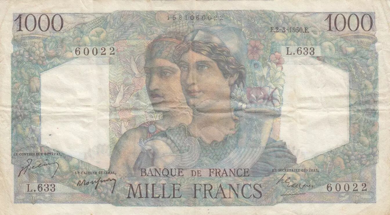Accueil > Billets Français > Billets Banque de France > France 1000 Francs Minerve et Hercule - 02-03-1950 - Série L.633