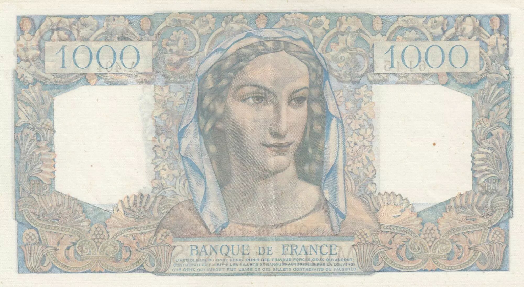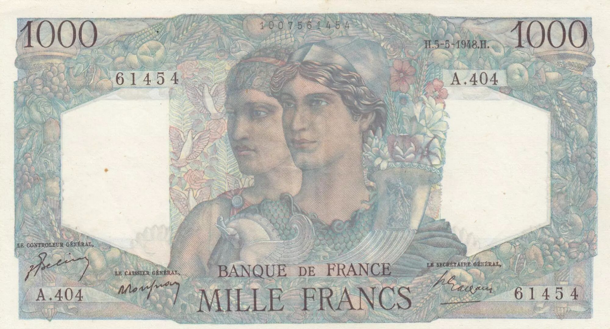 Ce billet de banque français d'une valeur nominale de 1000 francs a été émis en 1948. Il appartient à la série A.404. Ses dimensions sont de 172 millimètres de longueur pour 95 millimètres de largeur.