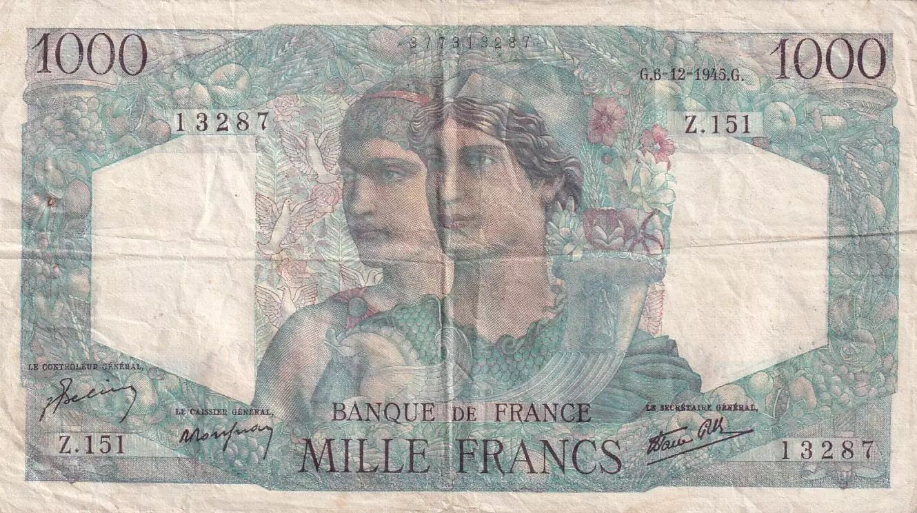 Accueil > Archivage > France 1000 Francs Minerve et Hercule - 06-12-1945 - Série Z.151 - F.41.09