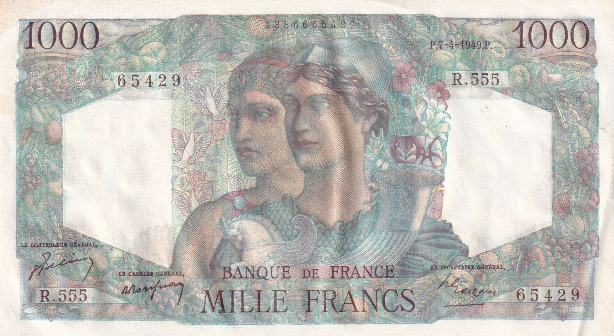 Accueil > Billets Français > Billets Banque de France > Billets 1000 francs > Minerve et Hercule type 1945 (1945-1950) > France 1000 Francs Minerve et Hercule - 07-04-1949 - Série R.555 n°65429 - SPL