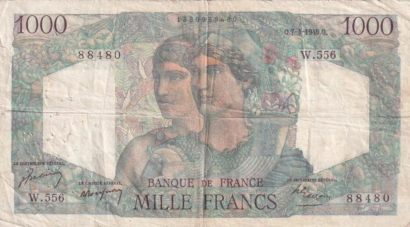 Accueil > Billets Français > Billets Banque de France > Billets 1000 francs > Minerve et Hercule type 1945 (1945-1950) > France 1000 Francs Minerve et Hercule - 07-04-1949 - Série W.556 - F.41.26