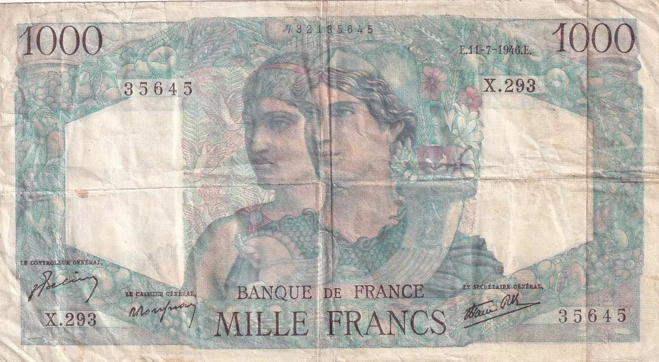 Accueil > Billets Français > Billets Banque de France > Billets 1000 francs > Minerve et Hercule type 1945 (1945-1950) > France 1000 Francs Minerve et Hercule - 11-07-1946 - Série X.293 - F.41.15