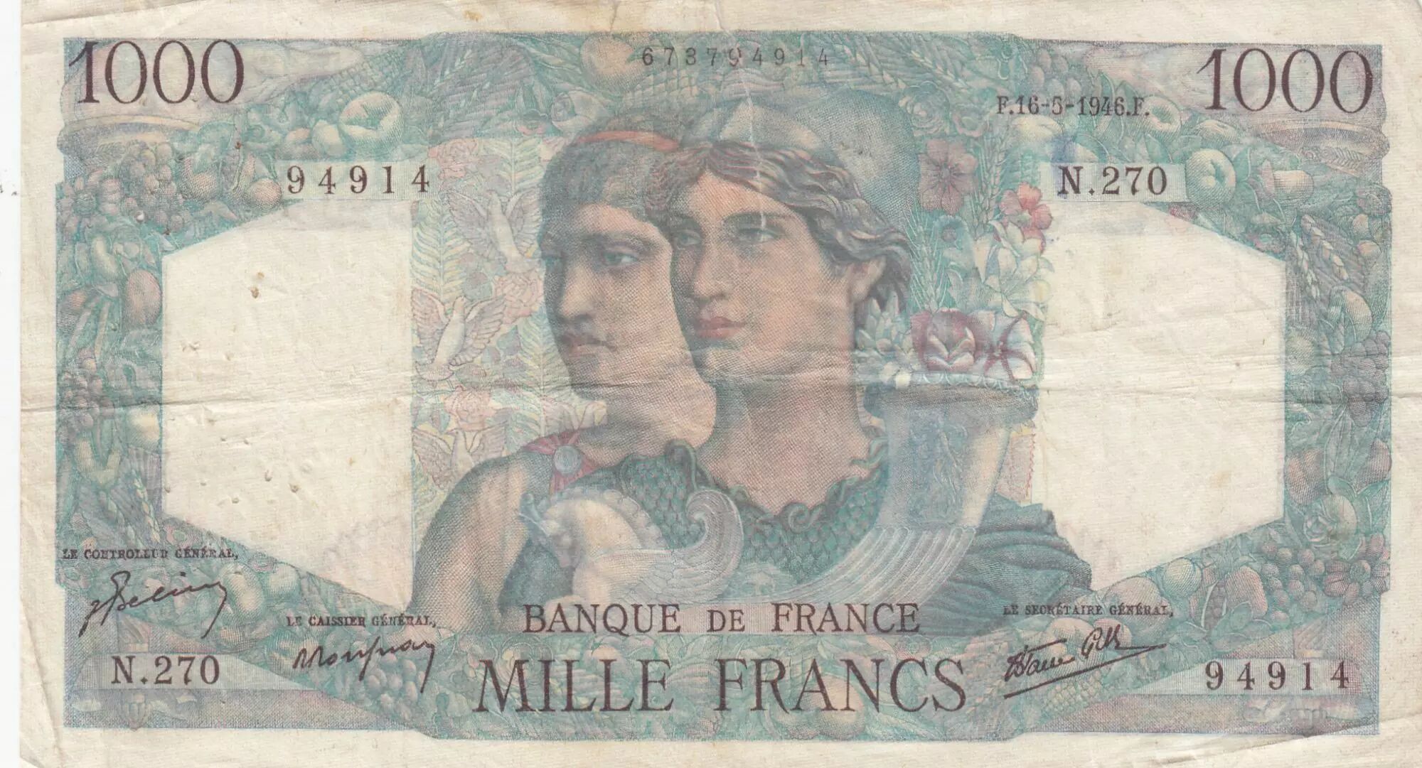 Accueil > Archivage > France 1000 Francs - Minerve et Hercule - 16-05-1946 - Série N.270 - F.41.14