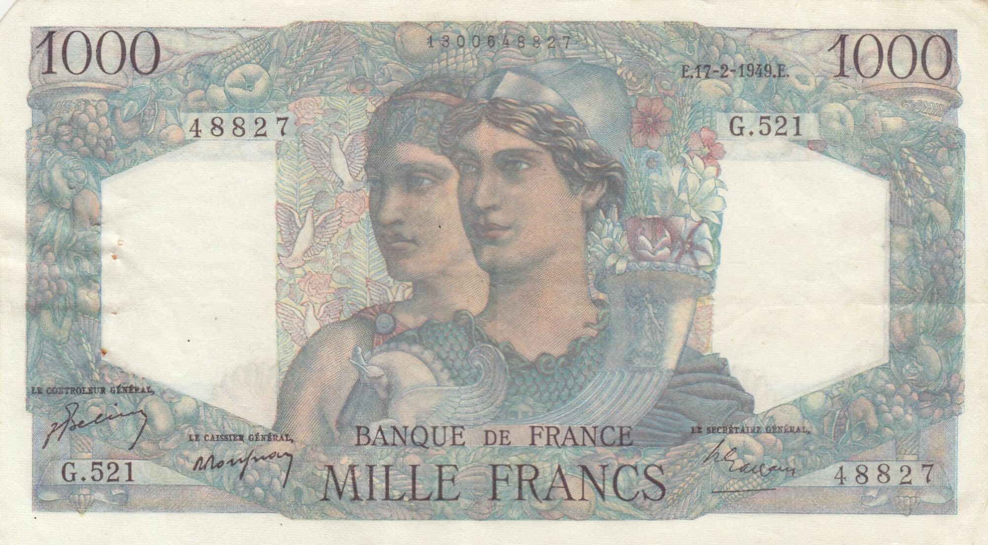 Ce billet de banque français a une valeur nominale de 1000 francs. Il a été émis en France le 17 février 1949. Il fait partie de la série G.521.