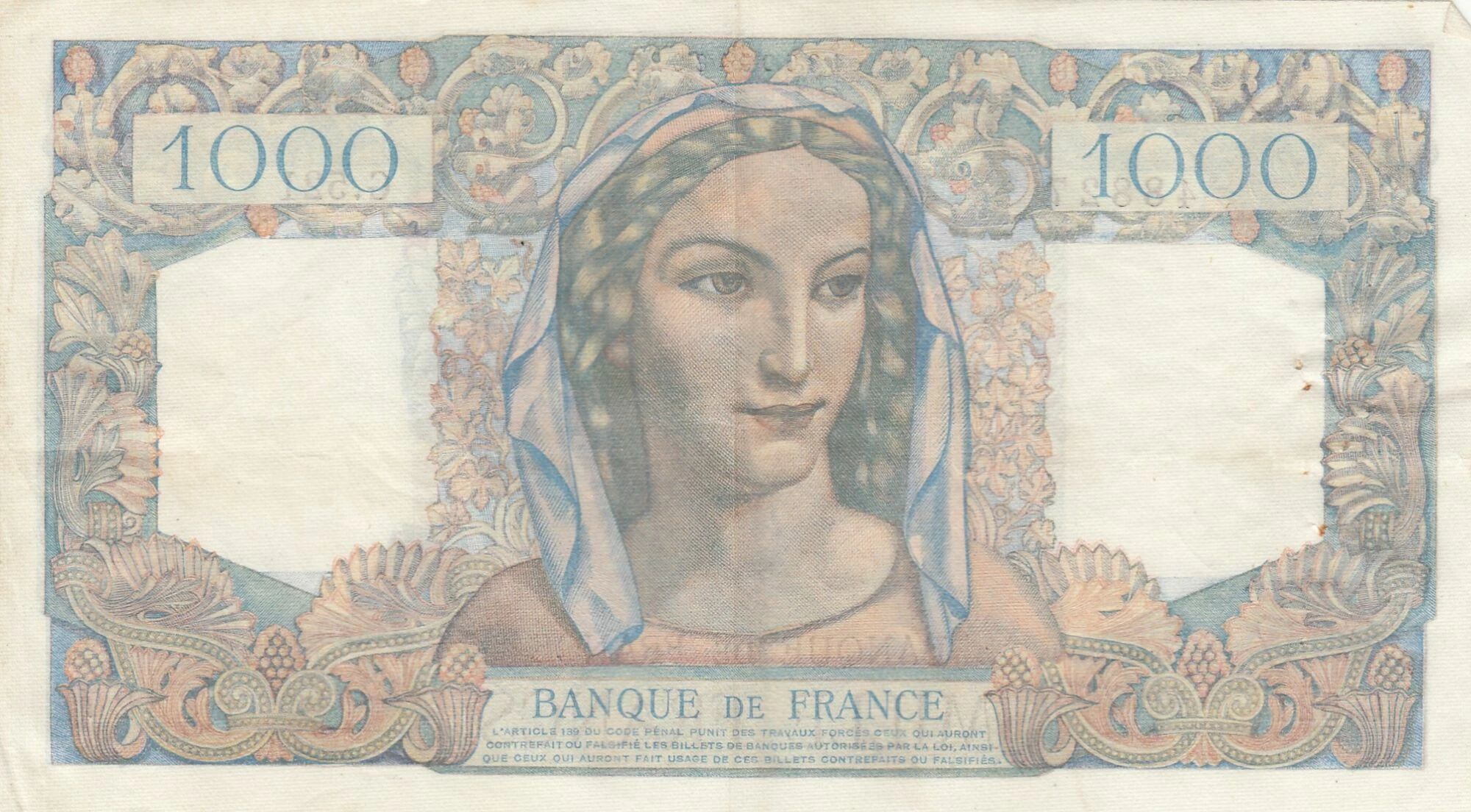 Ce billet de 1000 francs, émis en 1949, est un témoignage de l'histoire monétaire française et des symboles culturels qui ont marqué cette période. Les figures de Minerve et Hercule, issues de la mythologie classique, incarnent des valeurs importantes telles que la sagesse, la force et le courage, reflétant les aspirations de la nation à l'époque de son émission.